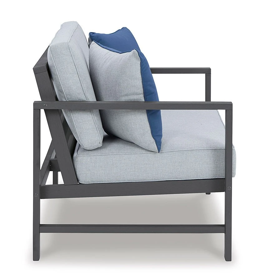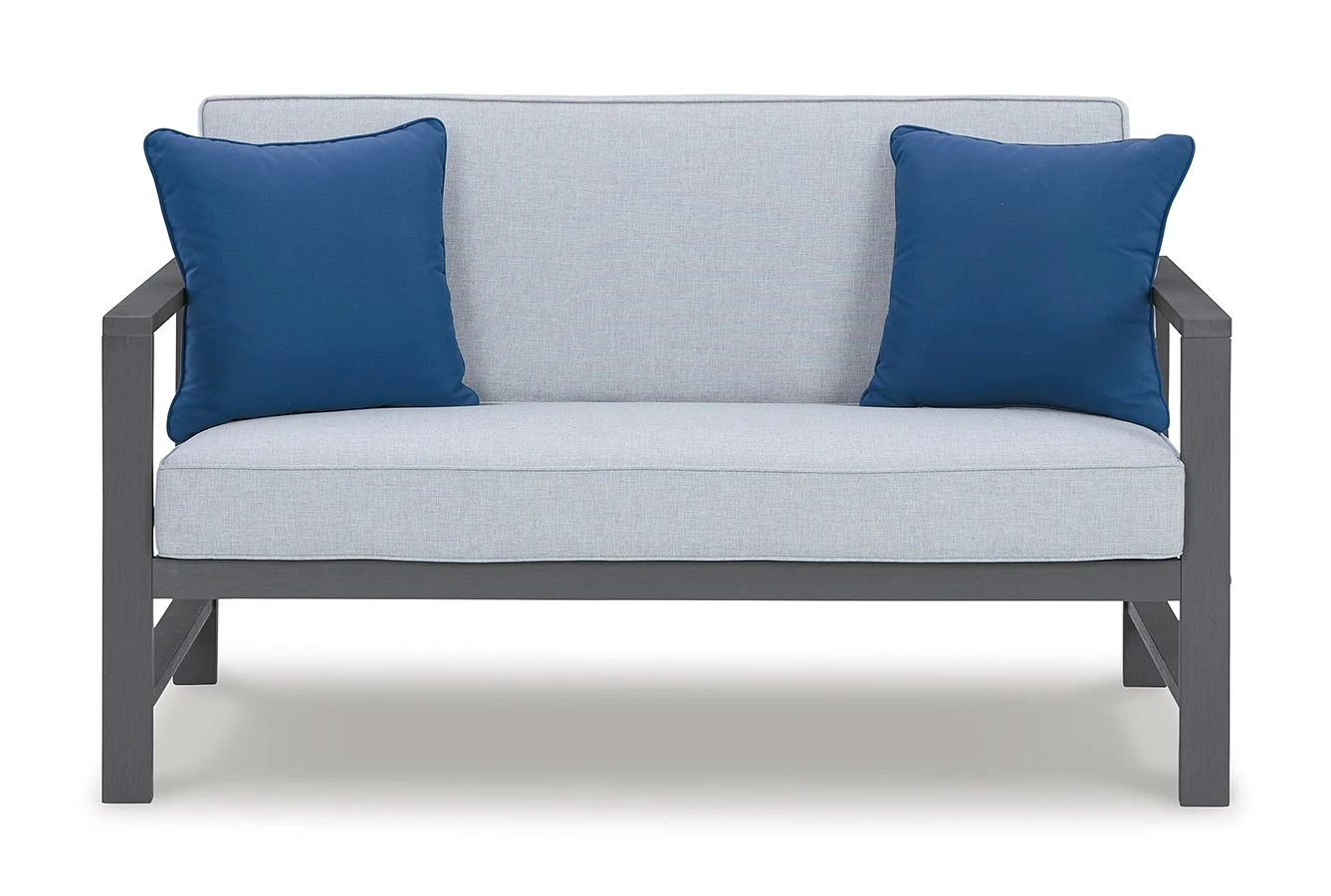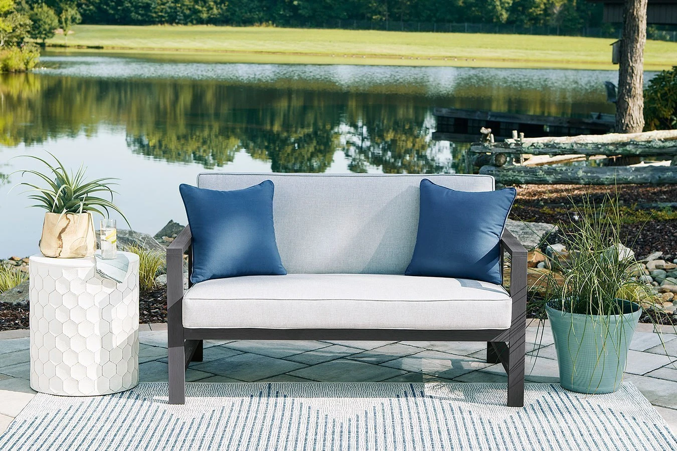- OverviewWith its sleek lines, gorgeous gray tone and cushioned comfort, this Fynnegan 2-piece outdoor loveseat with table set by Signature Design can make your outdoor space feel more like an upscale resort. Made for looks and longevity, this high-quality ensemble is built from eucalyptus wood treated to a deluxe embossed finish to brave the elements. The thick, all-weather seat cushion and back pillow are wrapped in a delightfully neutral Nuvella fabric that’s a breeze to clean. Pair of throw pillows add a coastal cool touch.