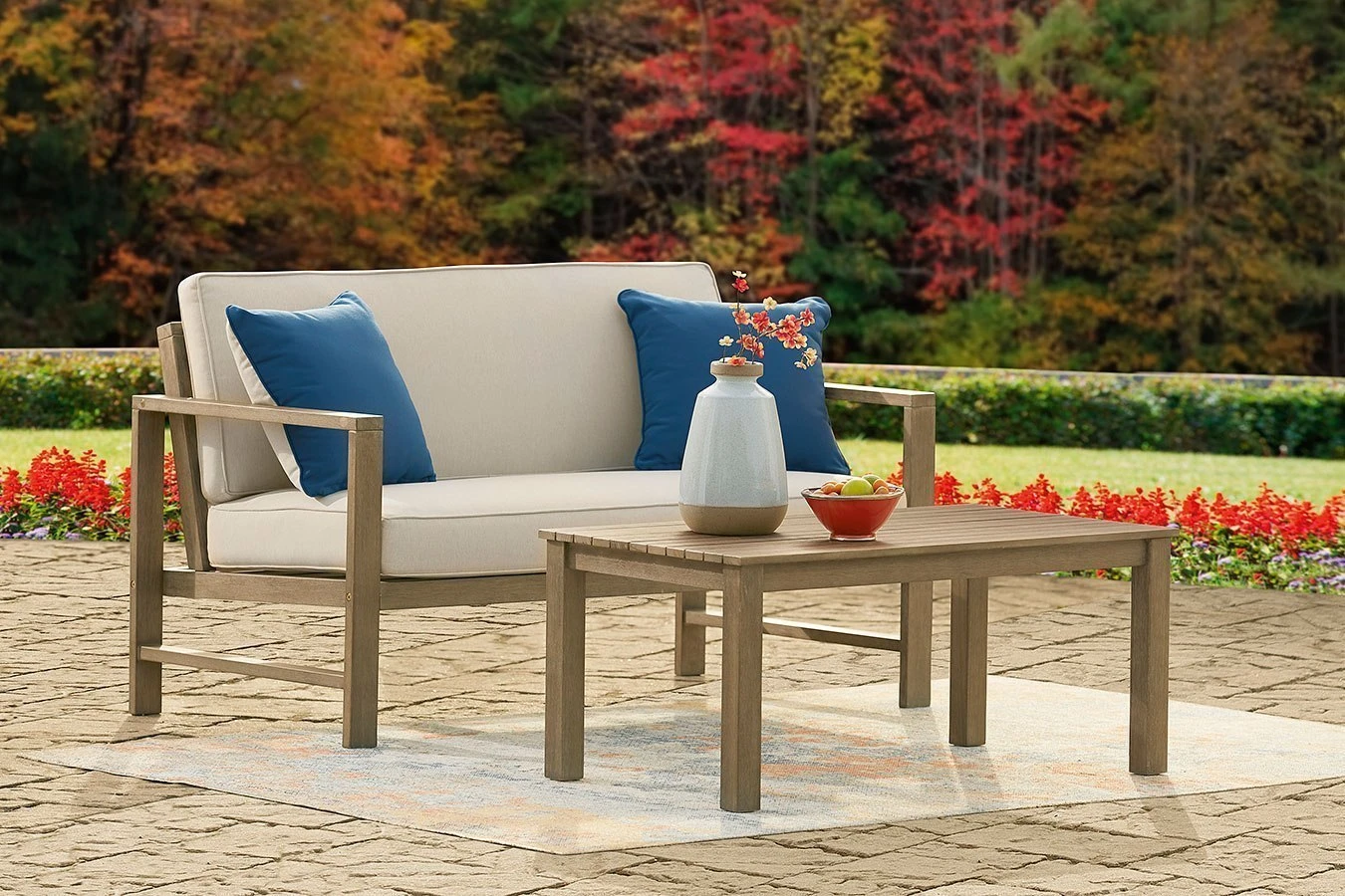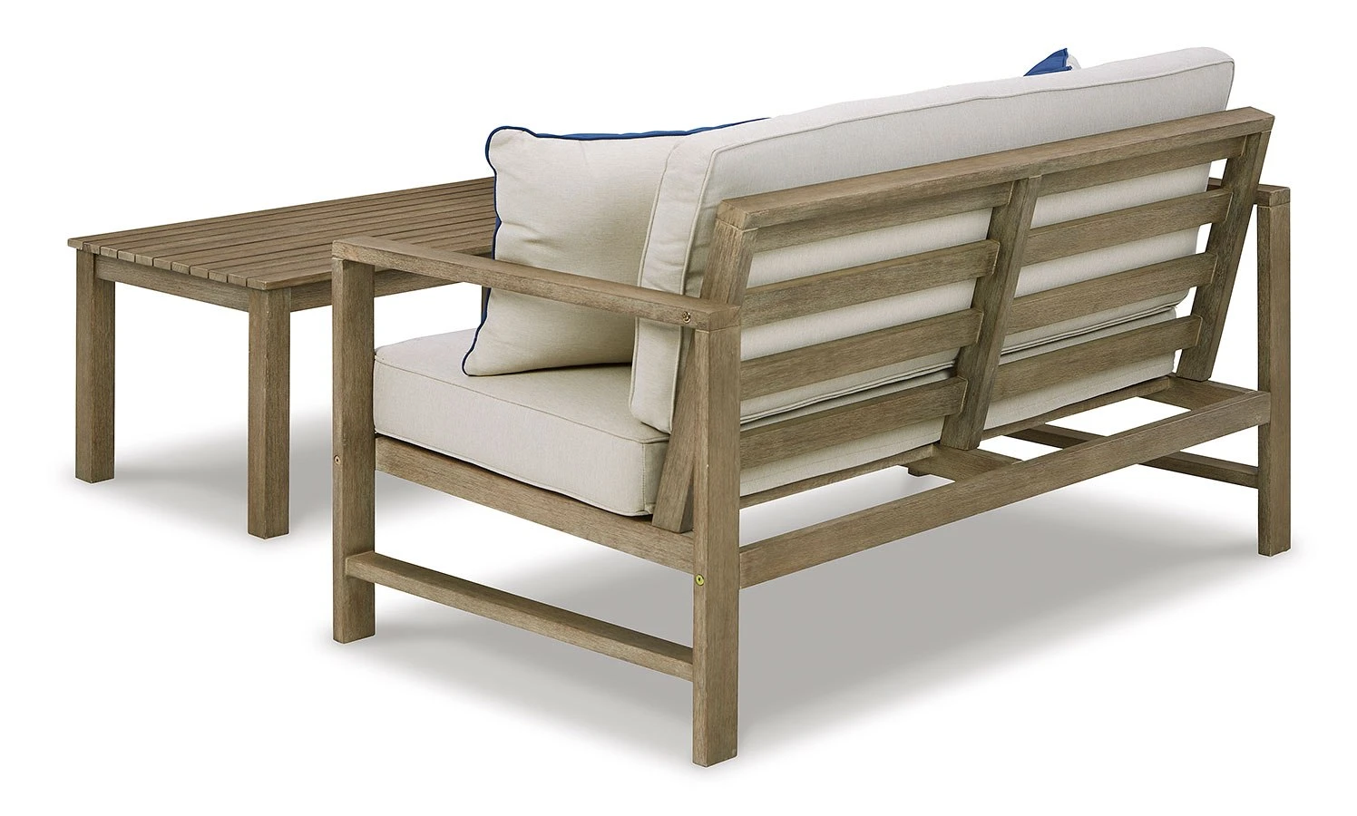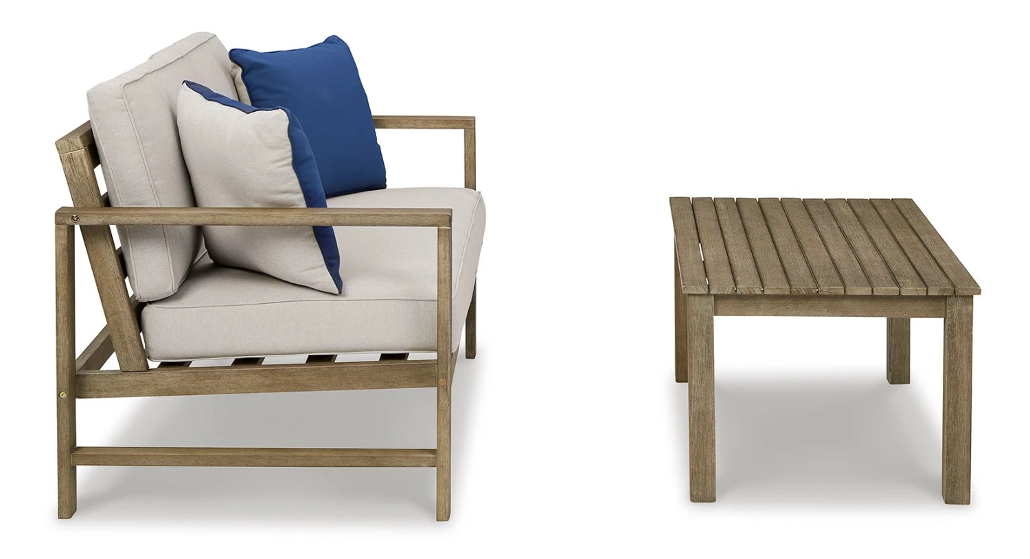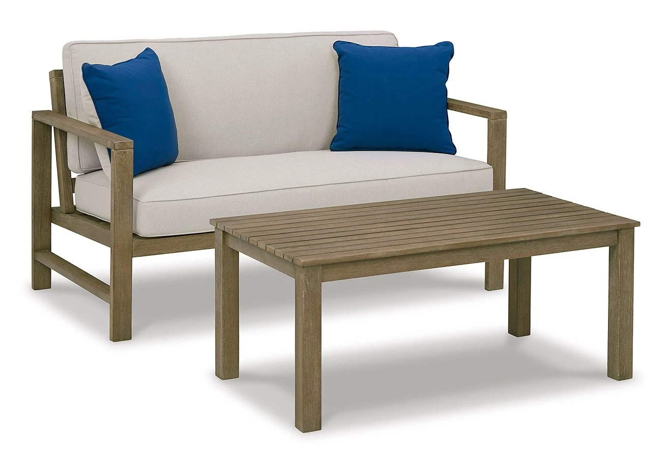 - OverviewWith its sleek lines, gorgeous driftwood tone and cushioned comfort, this Fynnegan 2-piece outdoor loveseat with table set by Signature Design can make your outdoor space feel more like an upscale resort. Made for looks and longevity, this high-quality ensemble is built from eucalyptus wood treated to a deluxe embossed finish to brave the elements. The thick, all-weather seat cushion and back pillow are wrapped in a delightfully neutral Nuvella fabric that’s a breeze to clean. Pair of throw pillows add a coastal cool touch.