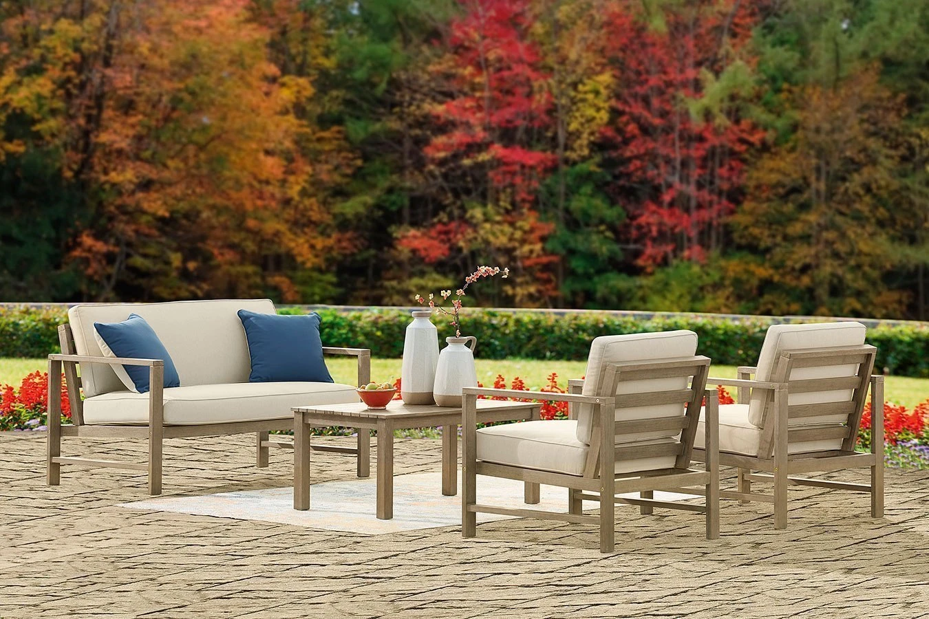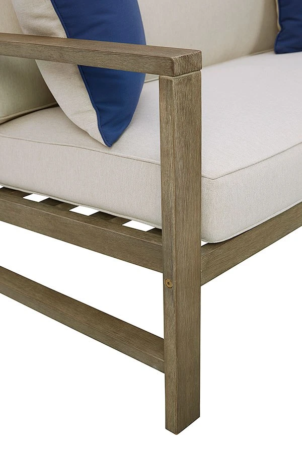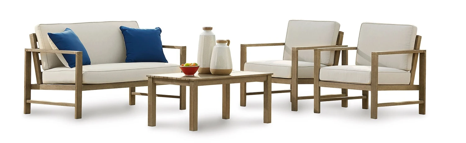 - OverviewWith its sleek lines, gorgeous driftwood tone and cushioned comfort, this Fynnegan Outdoor Seating Set by Signature Design can make your outdoor space feel more like an upscale resort. Made for looks and longevity, this high-quality ensemble is built from eucalyptus wood treated to a deluxe embossed finish to brave the elements. The thick, all-weather seat cushion and back pillow are wrapped in a delightfully neutral Nuvella fabric that’s a breeze to clean. Pair of throw pillows add a coastal cool touch.