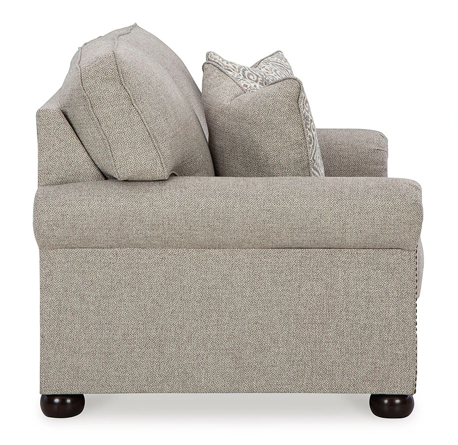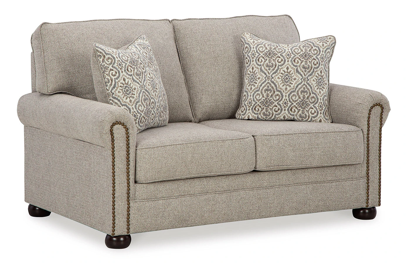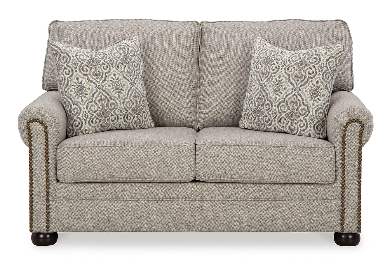 - OverviewInspired by the past but rooted firmly in the present, this Gaelon Loveseat by Signature Design complements your transitional seating area. Its versatile upholstery is delightfully detailed for a subtle herringbone effect. Designer touches like decorative nailhead trim and bun legs add traditional character. With this loveseat’s reliable style and comfort, all you need to do is sit back and relax.