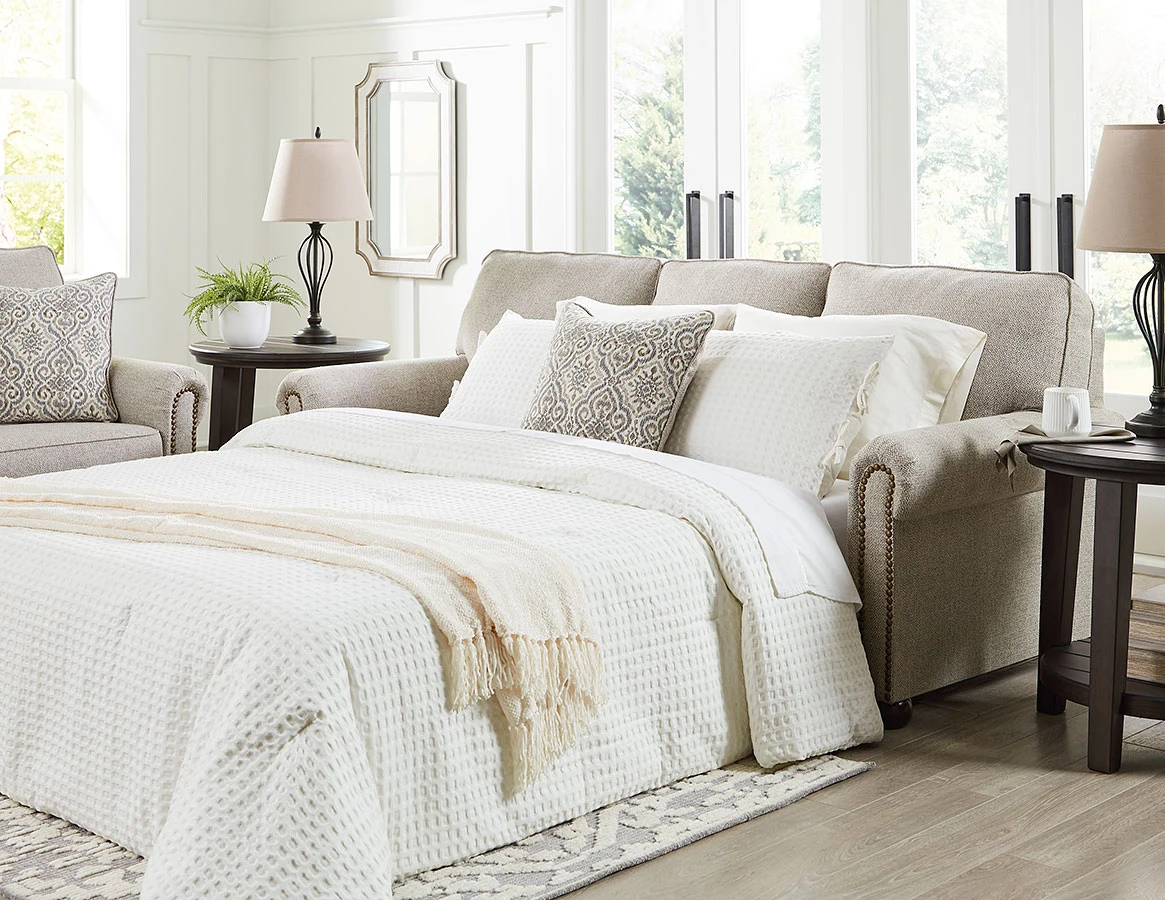- OverviewInspired by the past but rooted firmly in the present, this Gaelon Queen Sofa Sleeper by Signature Design complements your transitional seating area. Its versatile upholstery is delightfully detailed for a subtle herringbone effect. Designer touches like decorative nailhead trim and bun legs add traditional character. A handy pull-out mattress brings must-have function. With this sofa sleeper’s reliable style and comfort, all you need to do is sit back and relax.