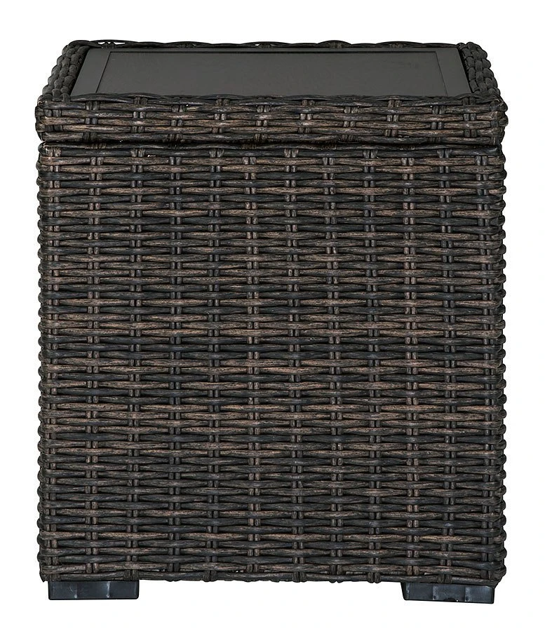 - OverviewStyle. Comfort. Quality. Value. This Grasson Lane Outdoor End Table by Signature Design really goes to town, giving you the total package for outstanding outdoor living. Crafted to withstand the elements, this outdoor table’s resin wicker base and rust-proof aluminum frame ensures carefree living, while the aluminum surfaces provide stylish appeal. Comfy and casual, it’s perfect for use inside or out.