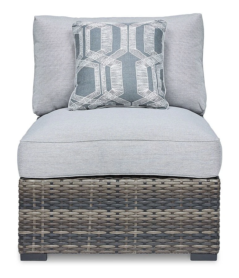 - OverviewThis cool, casual Harbor Court outdoor chair by Signature Design will raise the comfort level and visual appeal of your outdoor living space. Made of handwoven wicker in neutral tones of light and dark gray, the armless chair blends beautifully into your lanai or pool and patio area with thick, comfy cushions wrapped in Nuvella high performance fabric that is stain resistant, fade resistant and easy to clean. This cushioned armless chair can be used on its own or paired with other pieces of the matching sectional to create a space that holds up to Mother Nature and ages gracefully for years of enjoyment.