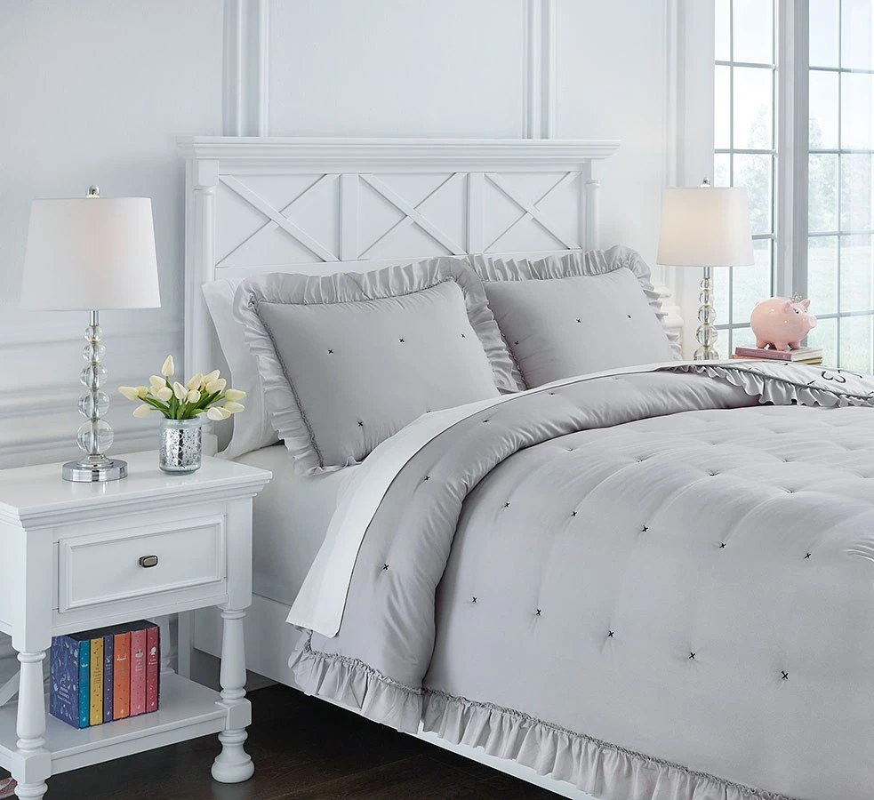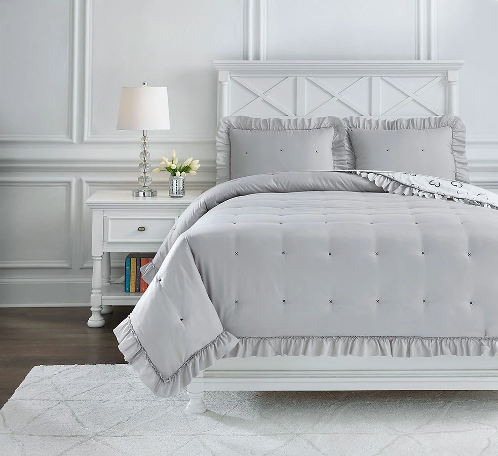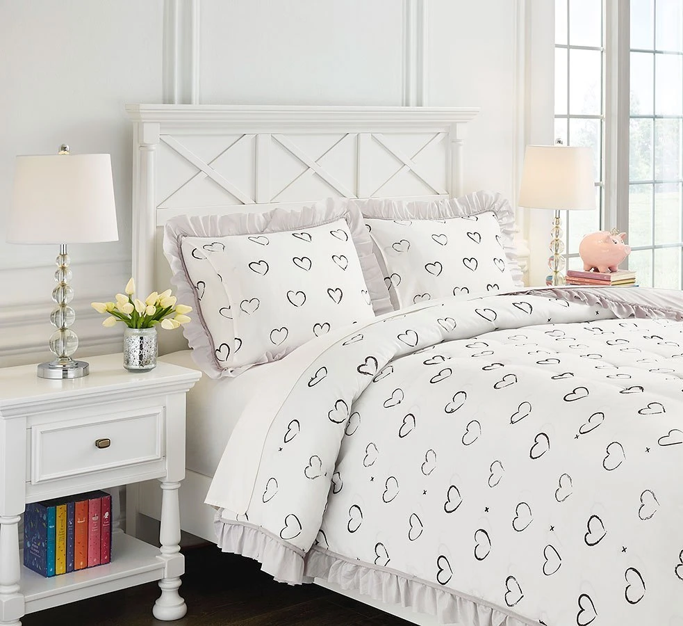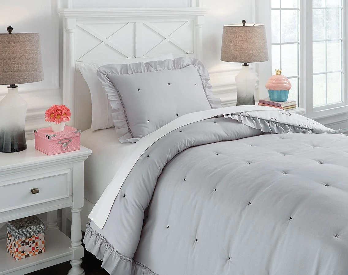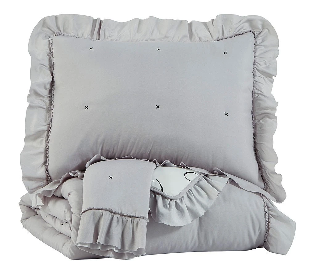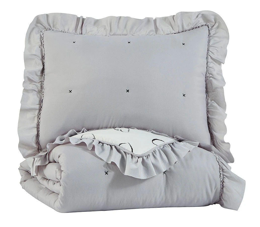 - OverviewThe Hartlen Comforter Set by Signature Design includes comforter and 2 shams (1 in twin). Solid with flange border in gray. Reverses to heart design in black and white.