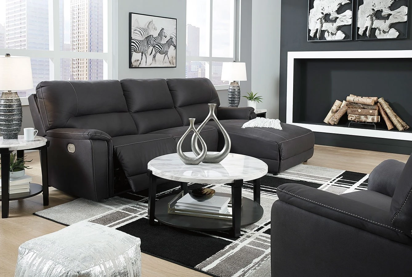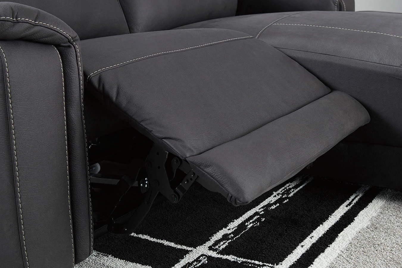 - OverviewWowing in a deep and dramatic shade of midnight gray, this Henefer power sectional by Signature Design reflects a clean-lined approach whose time has come. Offering the cool look of leather – but with a warm and cozy feel – this ultra-contemporary sectional entices with an Easy View power headrest that lets you fully recline and still have a primo view of the TV. Factor in chicly wrapped armrests, jumbo contrast stitching and a one-touch power control with USB plug-in, and you’ve got exceptional form and function from head to toe.
