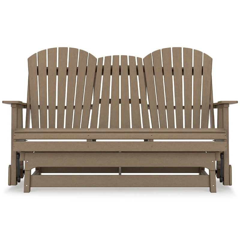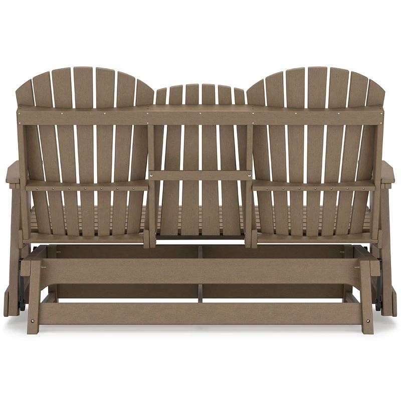 - OverviewDrift away from everyday worries and into outdoor bliss with this Hyland Wave Outdoor Glider Loveseat by Signature Design. Dressed in an inviting driftwood hue, the Adirondack-inspired design has a classic feel. It weathers sunny summer days and cozy winter nights with durable MEGA TUFF HDPE material. A drop-down console with integrated cup holders keeps refreshments and snacks within easy reach. With the console snapped into the back, this loveseat has even more room for enjoying lazy days in the shade.