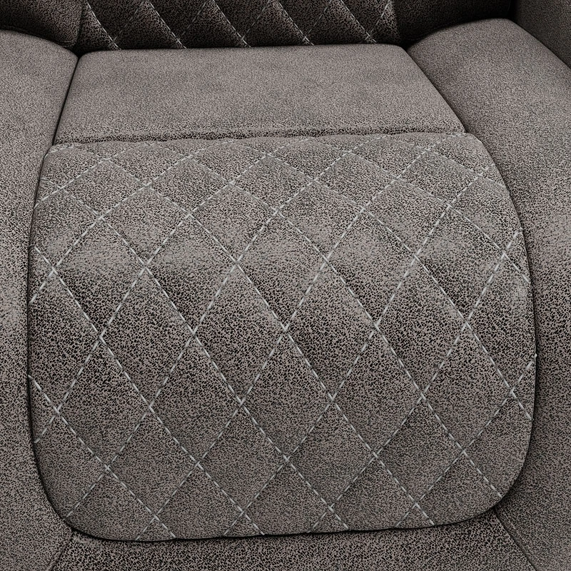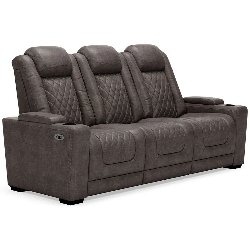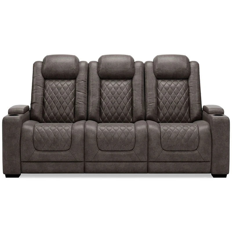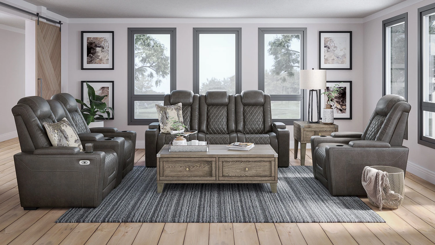 - OverviewThis HyllMont power reclining living room set in trendy gray is proof of just how far recliners have come when it comes to form and function. Ultra cool and contemporary, the fully loaded power reclining sofa makes it so easy to social distance and make home your haven. Dressed to impress with diamond stitching inspired by sports car interiors, the reclining sofa is covered in a fabulous faux leather with pebbled effect for authenticity. High-tech advancements include a one-touch power control with Easy View adjustable headrest and USB plug-in and a drop-down table with cup holders, flip-up light and AC power/USB plug-ins.