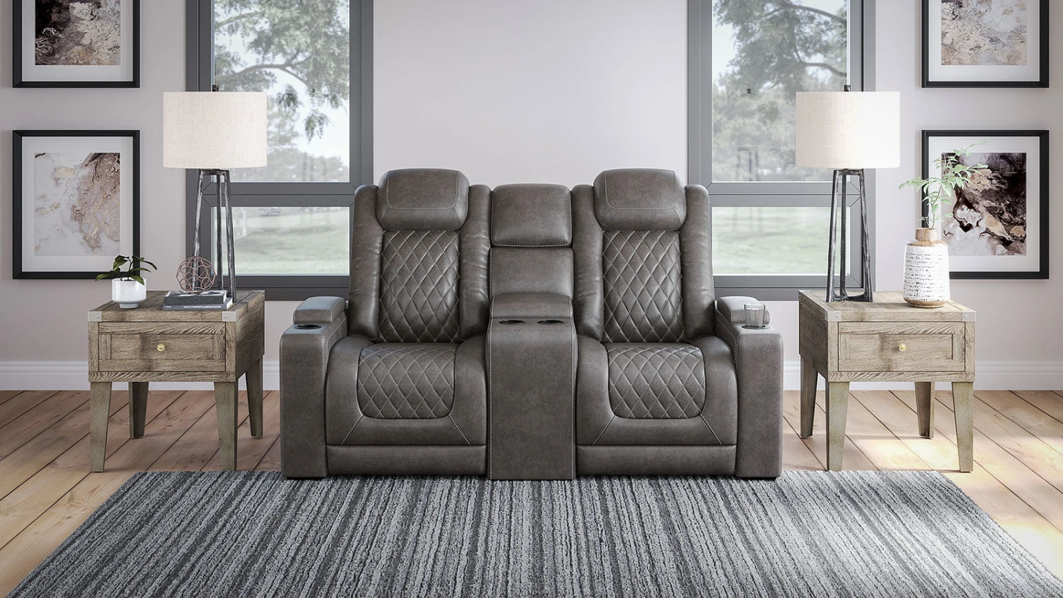 - Default Set Includes1 x HyllMont Gray Power Reclining Sofa w/ Adjustable Headrests 1 x HyllMont Gray Power Reclining Console Loveseat w/ Adjustable Headrests