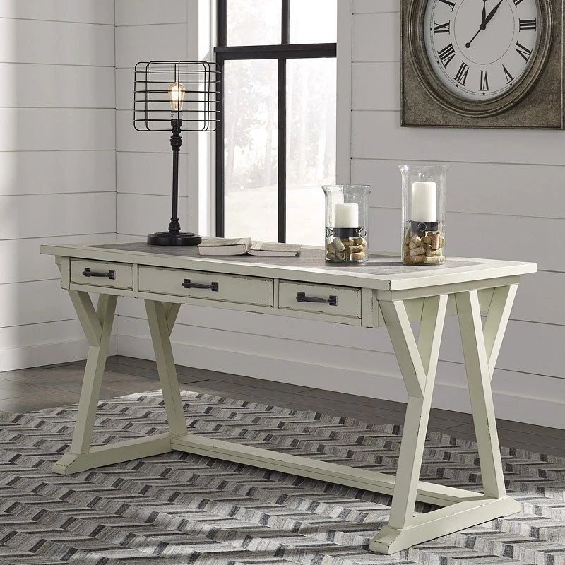 - OverviewCan’t decide between farmhouse or industrial style? Make a striking compromise with the Jonileene home office desk by Signature Design. Generously scaled and loaded with charm, it includes a trio of smooth-gliding drawers to help you stay organized. Faux cement top adds another layer of interest.