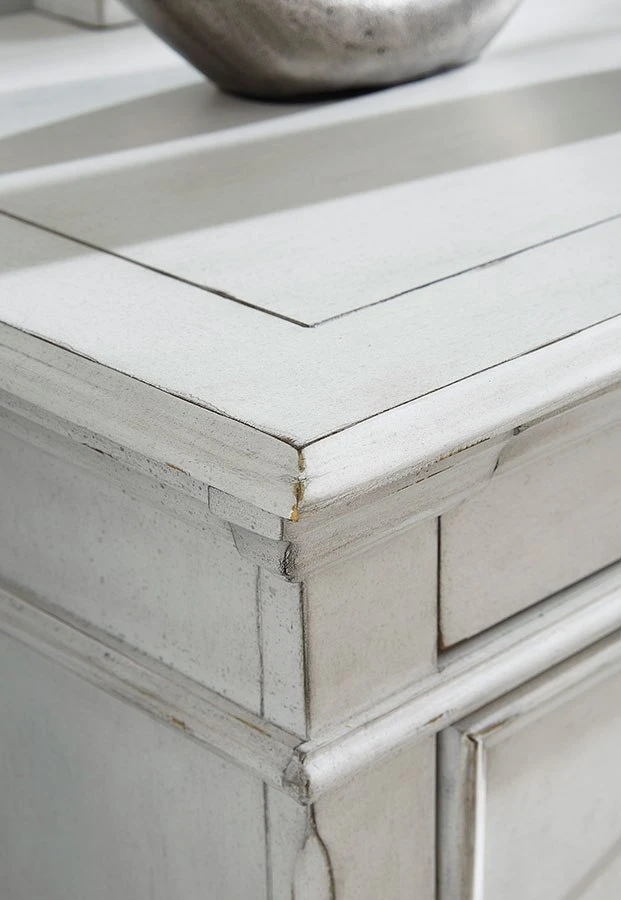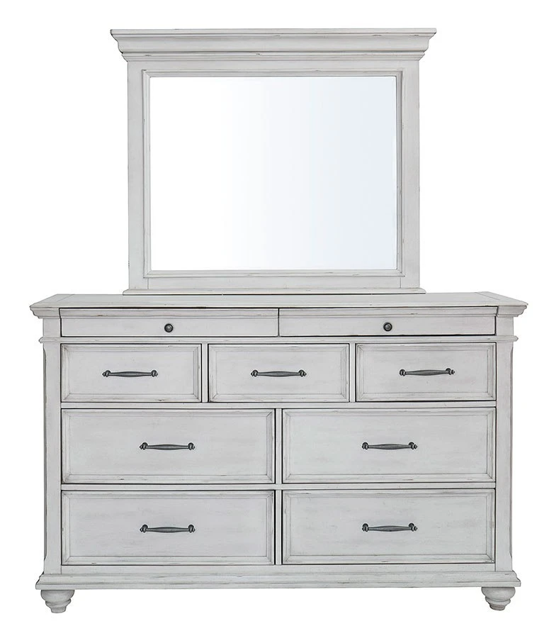 - OverviewGive your retreat vintage charm and valuable drawer storage with the Kanwyn dresser by BenchCraft. In a beautifully distressed whitewashed finish, you’ll love putting it all away in casual style. Seven full-sized drawers and two accessory top drawers will easily accommodate your needs. Generously scaled moulding from top to bottom, along with bun feet and drawer handles with a transitional aesthetic, give this dresser character – invoking the feel of a quaint cottage escape.