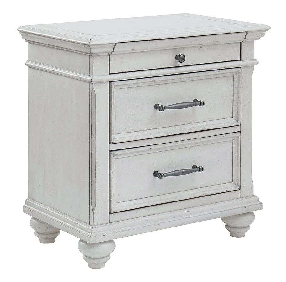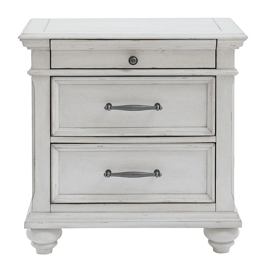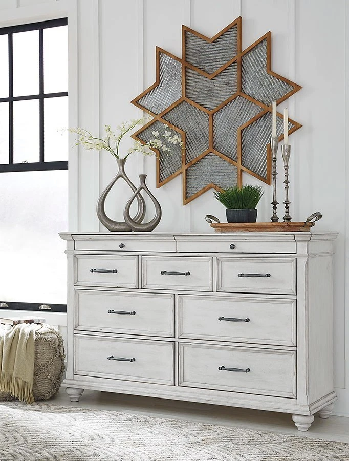 - OverviewGive your retreat vintage charm and valuable drawer storage with the Kanwyn Bedroom Collection by BenchCraft. In a beautifully distressed whitewashed finish, you’ll love putting it all away in casual style. The full-sized drawers and accessory top drawers will easily accommodate your needs. Generously scaled moulding from top to bottom, along with bun feet and drawer handles with a transitional aesthetic, give this collection character – invoking the feel of a quaint cottage escape.