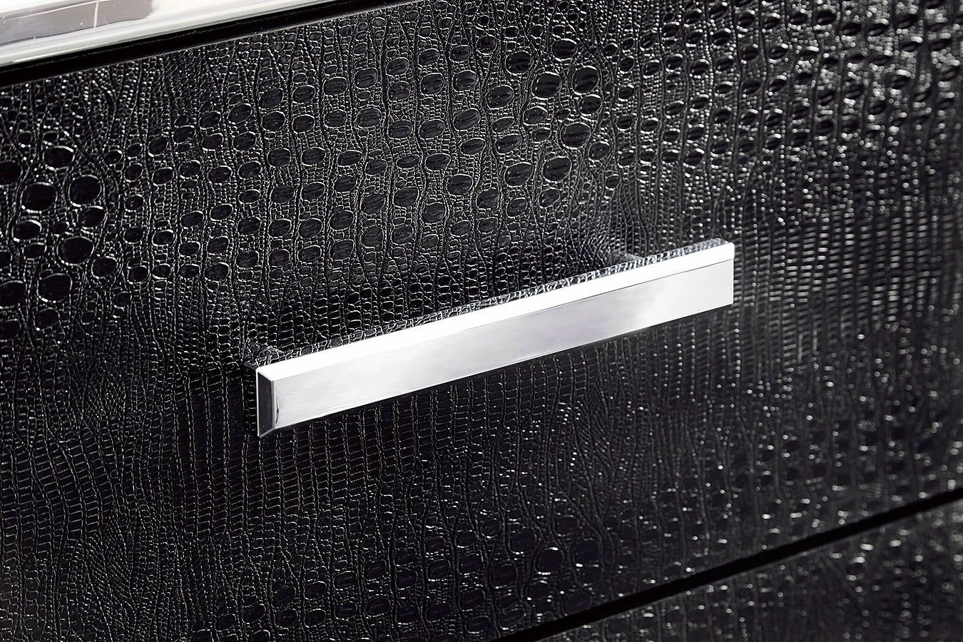 Chrome-tone faceted accents and faux alligator panels