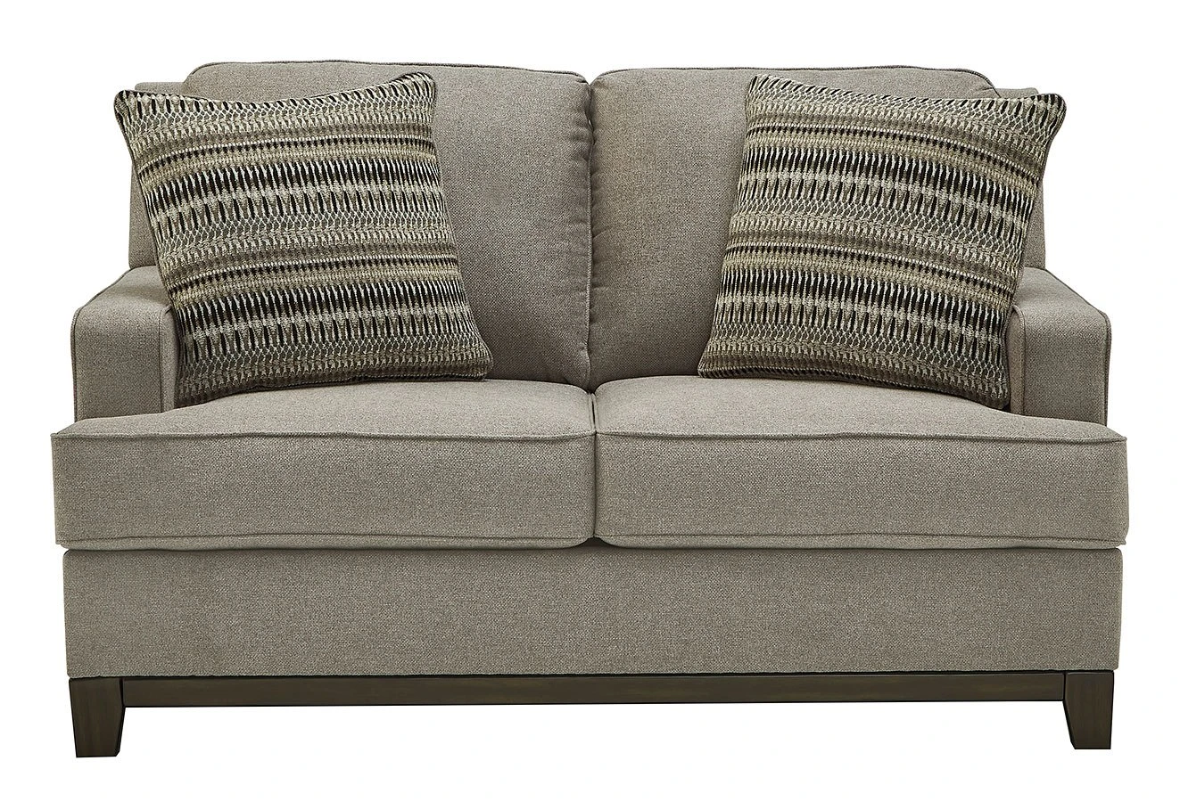 - OverviewWhether your style is American classic, contemporary or an eclectic mix, this beautifully versatile Kaywood loveseat by Signature Design is sure to look right at home. Distinctive elements include an exposed rail, designer accent pillows and decadent woven upholstery in a rich neutral shade inspired by tailored menswear.
