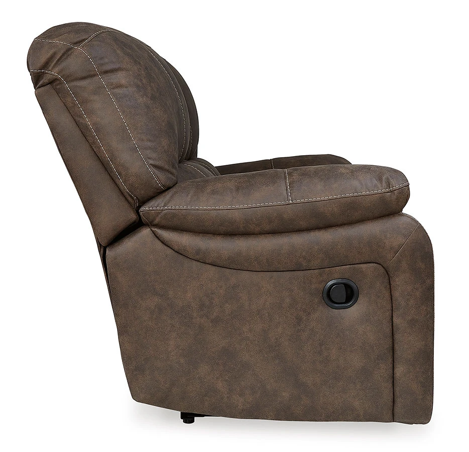 - OverviewLiving room lounging, with a touch of simply stunning character. This Kilmartin reclining loveseat by Signature Design seamlessly complements your contemporary cozy space. Accented by jumbo stitching, the versatile chocolate faux leather is a tried-and-true approach to everyday style. And with only a simple pull needed to extend the recliner on either side, this piece proves homey, inviting design and superb comfort go hand in hand.