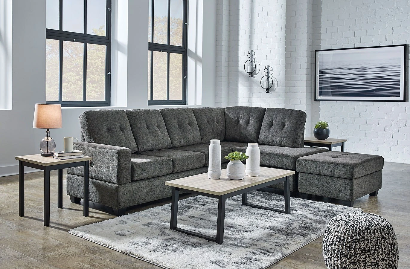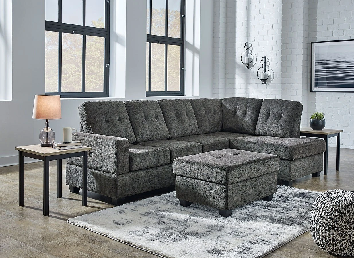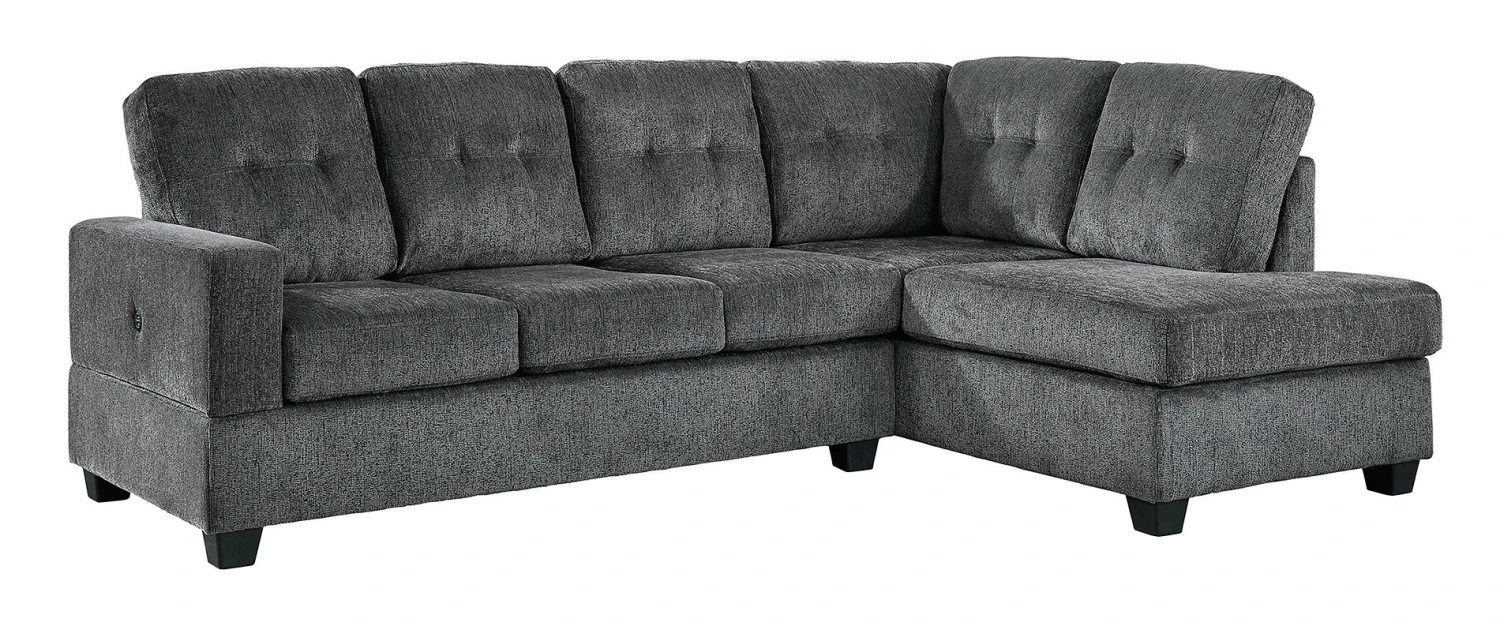 - OverviewRelax and unwind in an utterly contemporary fashion with this Kitler Sectional by Signature Design. Its linear structure brings a sleek touch to your living room seating area. The smoky gray upholstery has a luxe-meets-casual feel sure to satisfy your need for high-end style at an affordable price. Adding a layer of function, dual USB ports allow you to keep your devices on-hand while charging.