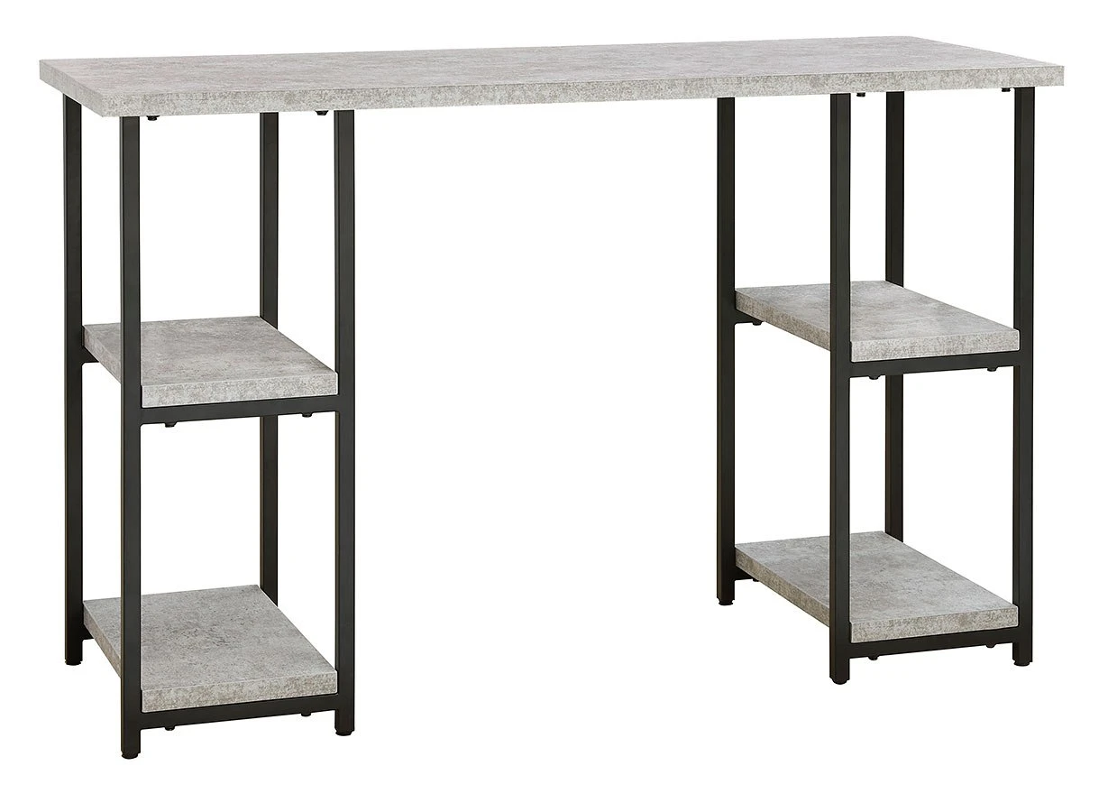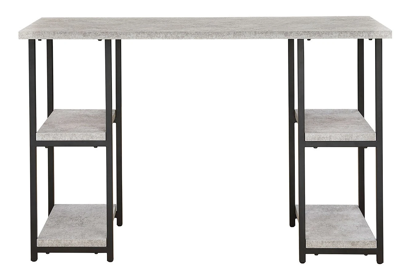 - OverviewCasual linear style is ideal to keep your home office aesthetic appealing and clean. This Lazabon desk by Signature Design features an architectural look with its faux concrete melamine top and a metal base in a dark pewter-tone finish, for the perfect balance of crisp and cool. The double-shelf pedestal design offers additional storage space. Melamine is an increasingly popular choice for table surfaces. It can be manufactured to resemble wood grain but with kid-friendly durability.