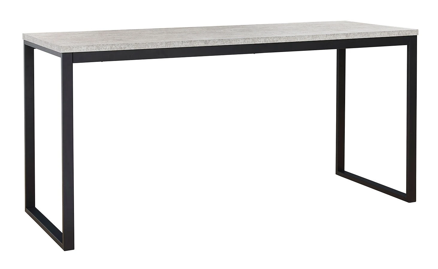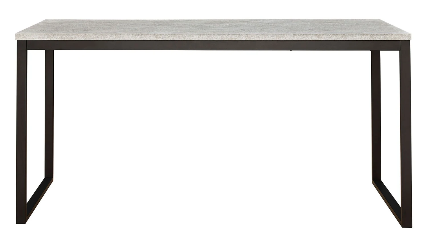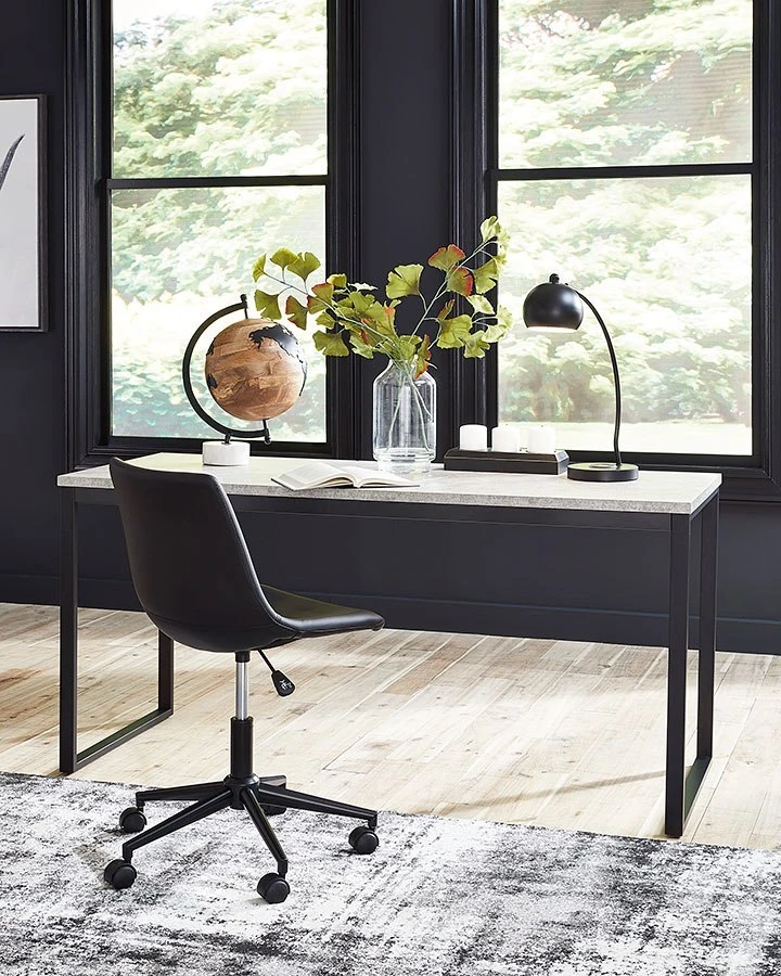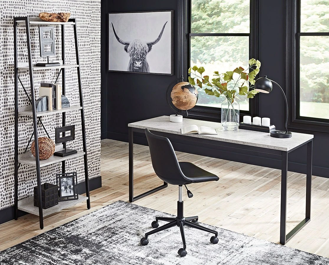 - OverviewCasual linear style is ideal to keep your home office aesthetic appealing and clean. This Lazabon desk by Signature Design features an architectural look with its faux concrete melamine top and a metal base in a dark pewter-tone finish, for the perfect balance of crisp and cool. Melamine is an increasingly popular choice for table surfaces. It can be manufactured to resemble wood grain but with kid-friendly durability.
