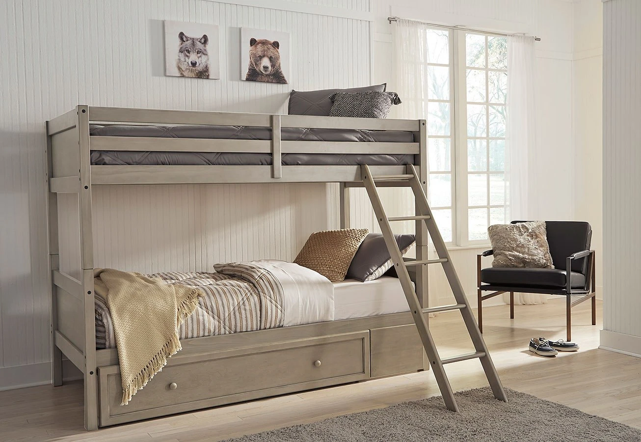 - OverviewDouble the space means twice the fun, and that’s what they’ll enjoy with this Lettner Bunk Bed by Signature Design. Forever classic design details – under bed storage, a sturdy ladder and safety rails – are paired with a burnished gray finish that elevates the look with modern sensibility.