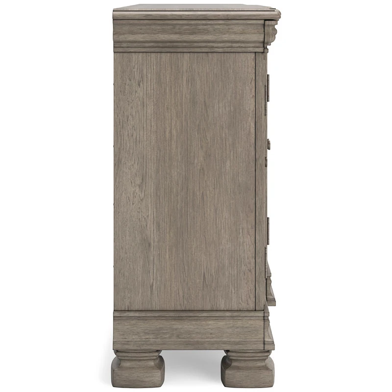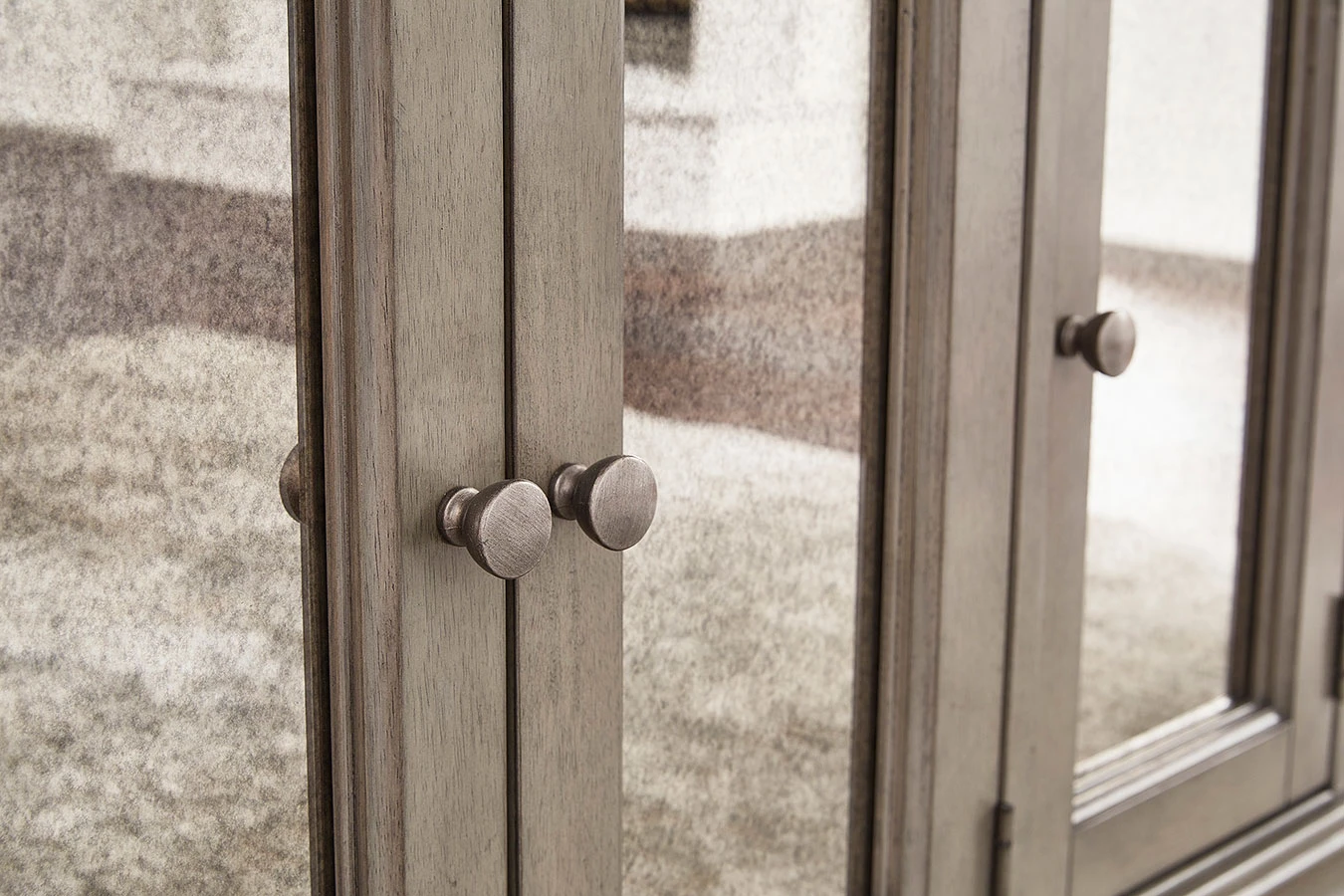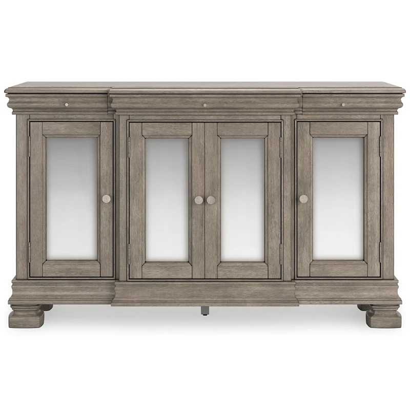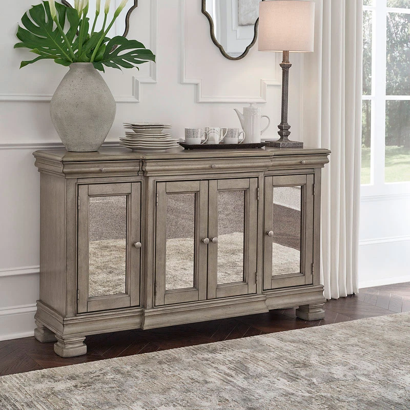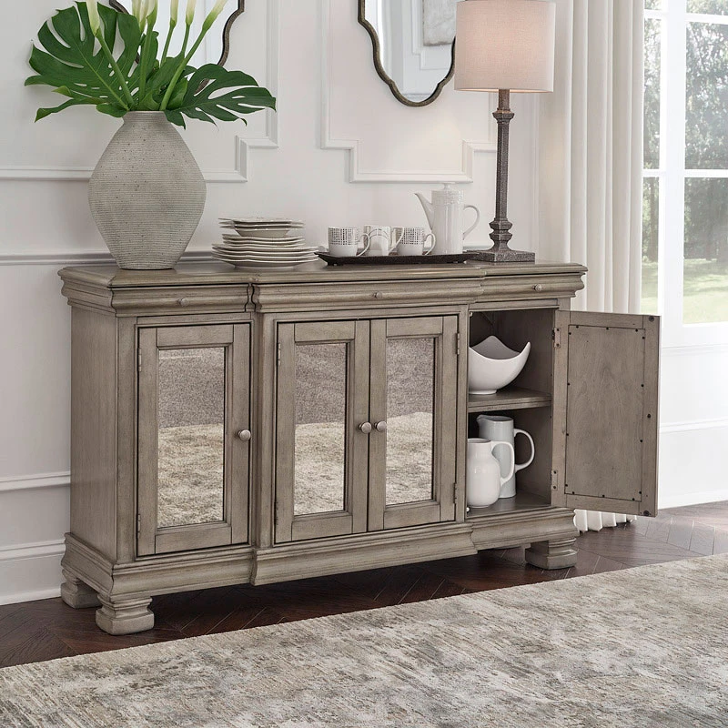 - OverviewTraditional design motifs, redefined for today’s trends. Inspired by timeless Louis Philippe styling, this Lexorne Dining Server by Signature Design is distinguished by its stunning attention to detail. You’ll find the light gray finish encourages an attitude of laid-back luxury. Complete with antiqued mirror doors and subtle storage drawers, it reigns over your dining room with an air of casual elegance.