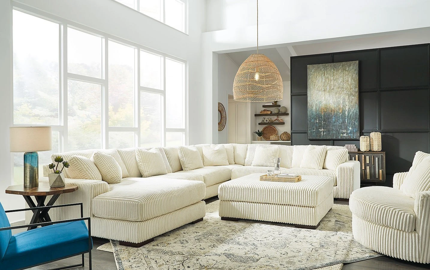 - OverviewPlush and posh. Showcase your eye for on-trend texture with the statement-making cord upholstery of this Lindyn Sectional by Signature Design. Its stunningly soft fabric entices in an ivory hue, complementing contemporary color palettes. Sink into the cushions and plan to stay a while – this cozy living room centerpiece highlights your high-end approach to comfort and style.