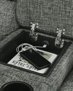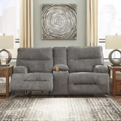 HyllMont Gray Power Reclining Console Loveseat W/ Adjustable Headrests
