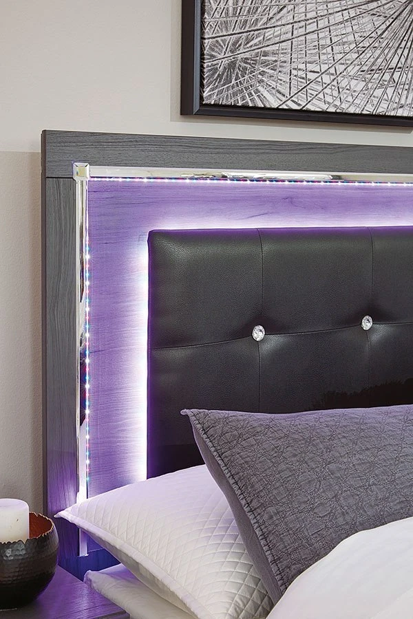 - OverviewReminiscent of Hollywood glamour of yesteryear, the Lodanna Bedroom Collection by Signature Design interprets luxury in a decidedly modern way. Sumptuous details include button-tufted upholstery, faceted faux crystals and chrome-tone accents beautifully lit by LED lights enhanced with remote-controlled settings for color and brightness. Dazzling gray finish and faceted chrome-tone accents enhance the star power, while smooth-gliding drawers provide enough storage to appease your inner diva. Best of both worlds, nightstand includes USB or wireless device charging stations.