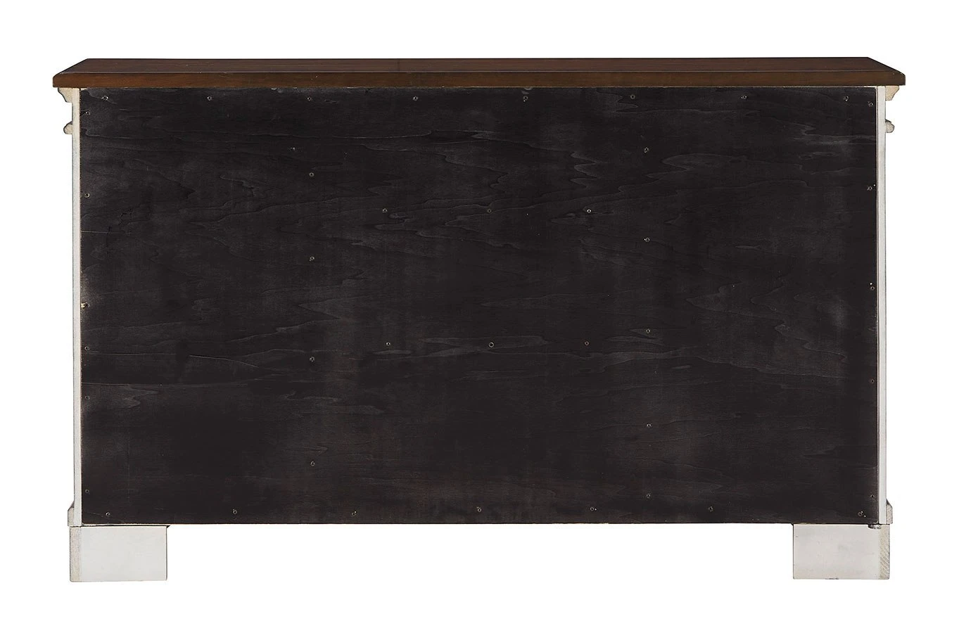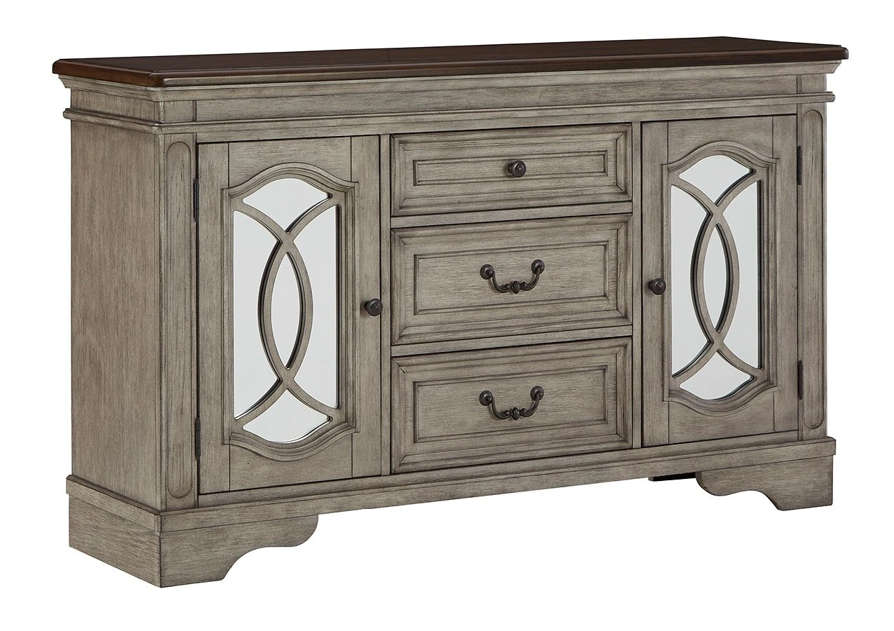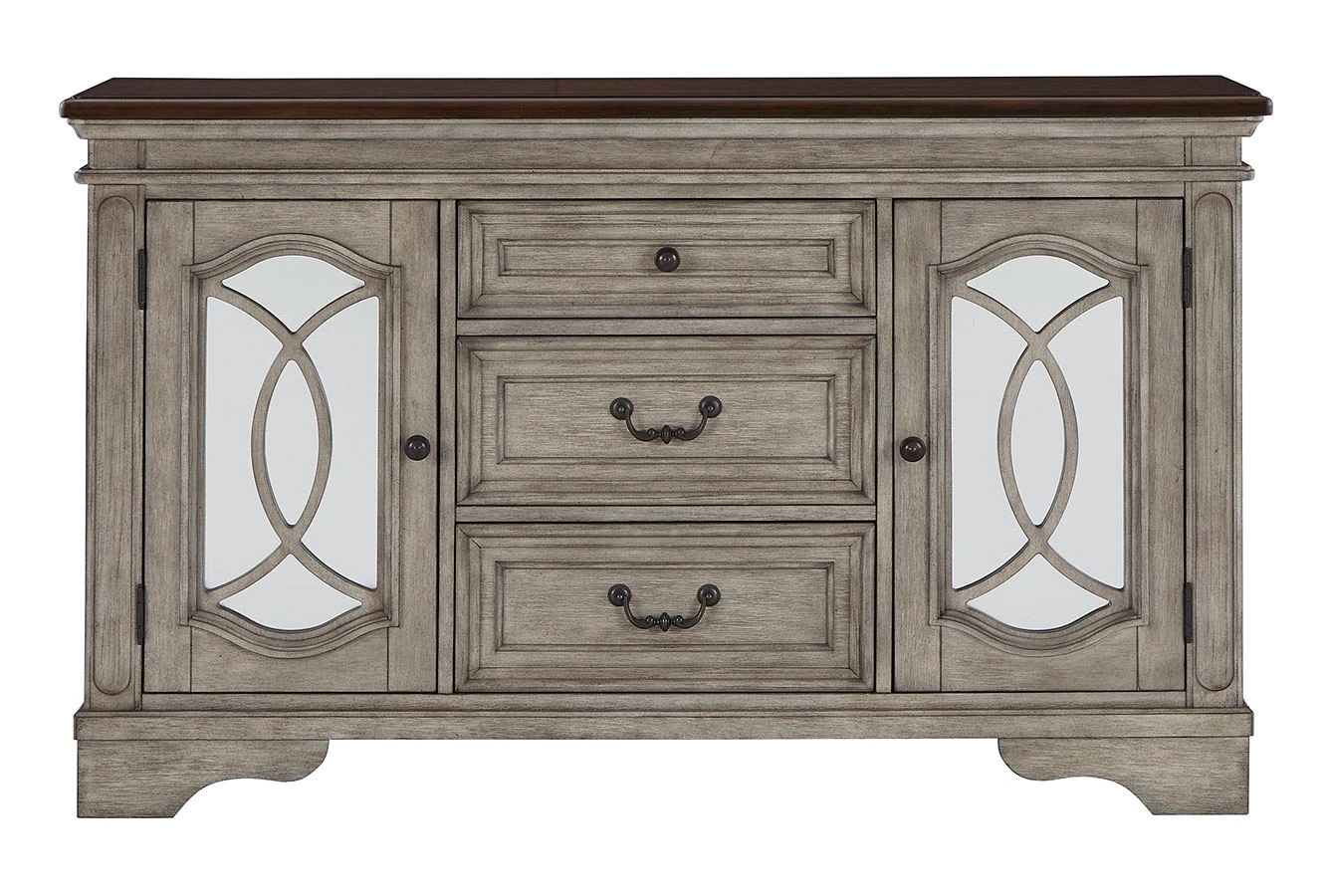 - OverviewServe up a sense of traditional cottage design with this Lodenbay Server by Signature Design. It features a pair of cabinet doors with inset mirrored glass and decorative fretwork. The server’s three smooth-gliding drawers with dovetail construction and black felt bottoms are perfect for storing more delicate items. An antiqued gray body and rich deep walnut brown top, along with bail pulls and knobs finished in a dark bronze tone, complete the beautiful design.