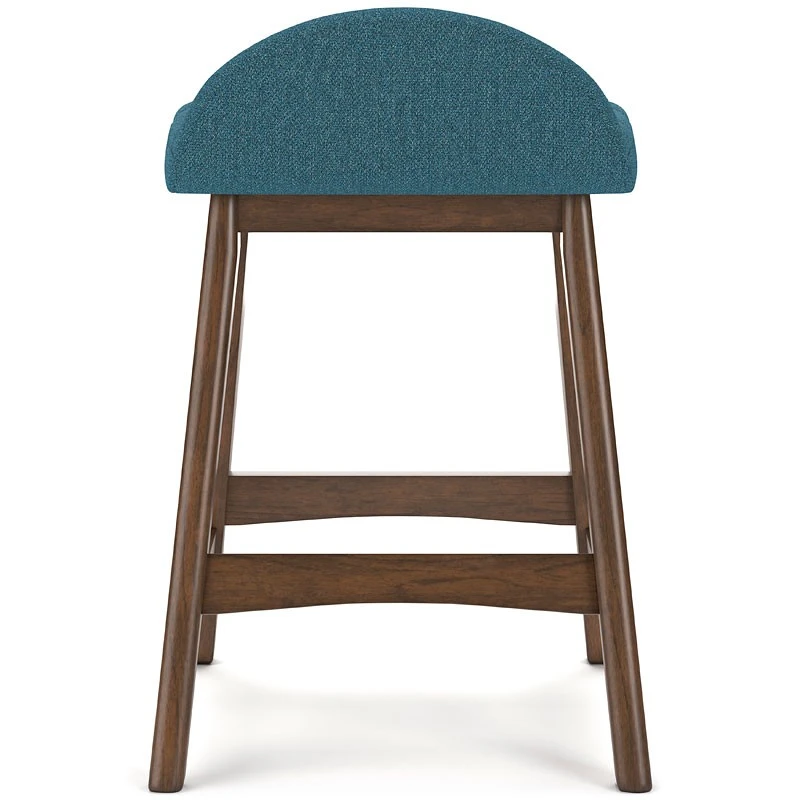 - OverviewA refreshed take on retro aesthetics. This Lyncott upholstered bar stool by Signature Design adds an air of playful simplicity to your dining space, capturing the architectural language of mid-century stylings. The seat invites the eye with a soft-edged silhouette and chic blue cushion. A casual, yet timeless, finish on the frame creates visual contrast to complete this study in form and function.