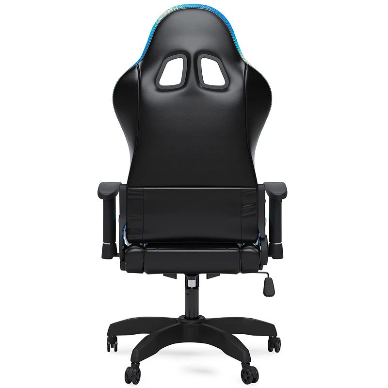 - OverviewTech this out: a swivel office chair that’s as cool as it is comfortable. The ultimate choice among gamers, the Lynxtyn swivel office chair by Signature Design is hard to beat. Quality crafted with a sturdy steel frame, this swivel office chair with comfy contoured seat and cutting-edge design is upholstered in a durable faux leather in gray and black. Cleverly integrated into the chair: powered LED lighting to enhance the gaming experience. Choose from six different colors or stream a mix of color using the remote control. With a swivel base, smooth-gliding casters and adjustable seat height/tilt feature, this office chair with fully reclining backrest has serious game.