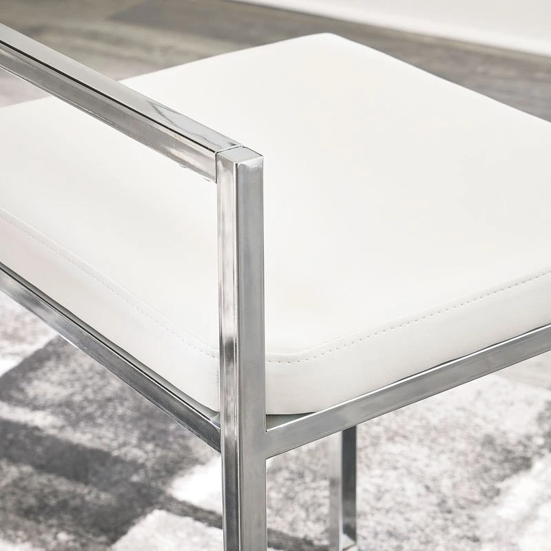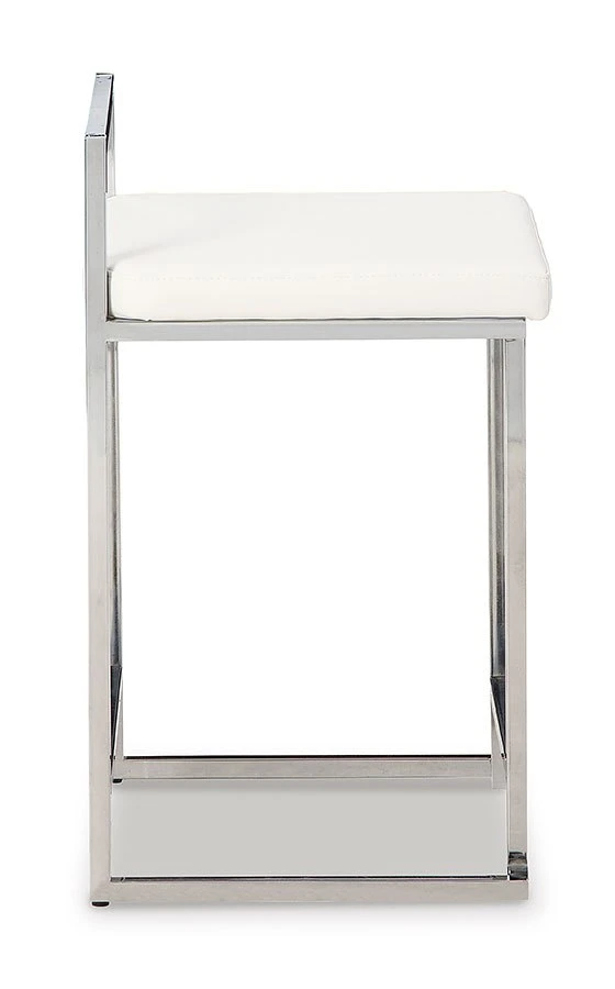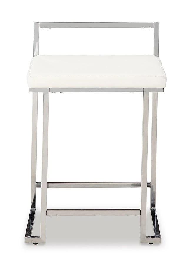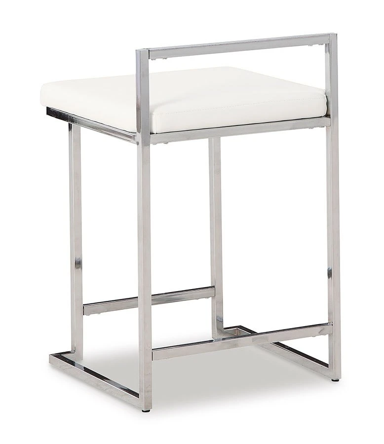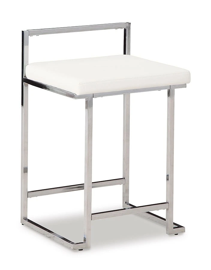 - OverviewWowing with a slim but sturdy profile and sculptural design, this Madanere counter height bar stool by Signature Design is sure to whet your appetite for ultra-contemporary style. Its comfortably cushioned seat is covered in a fabulous white faux leather, while the metal frame’s chrome-tone finish provides visual contrast.