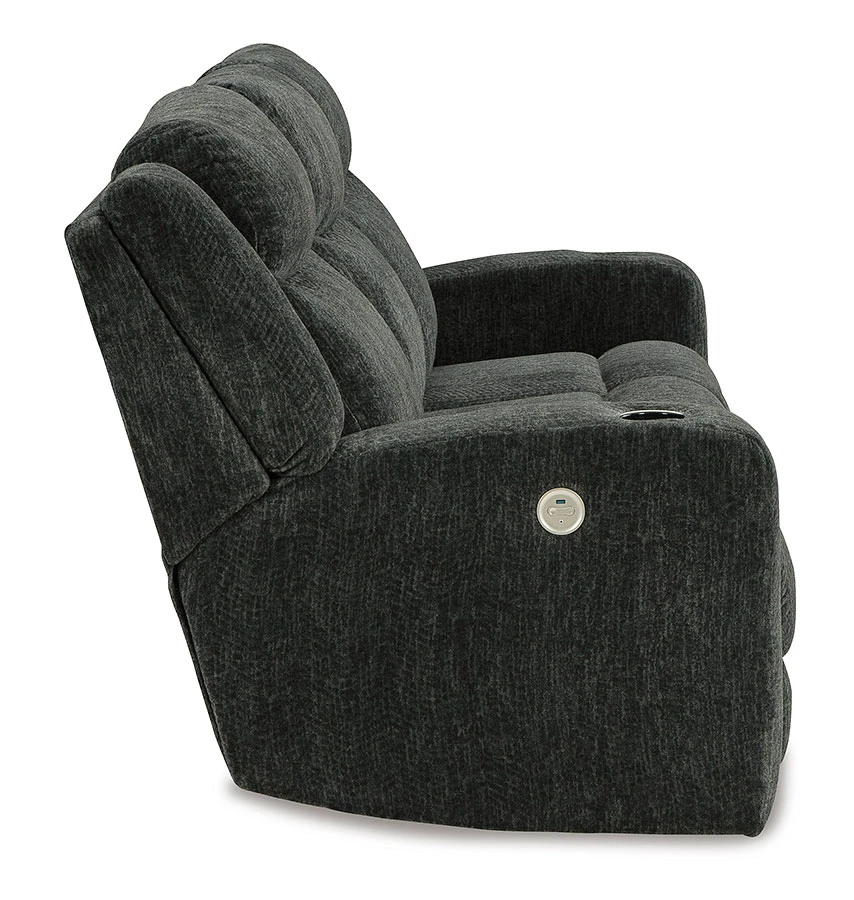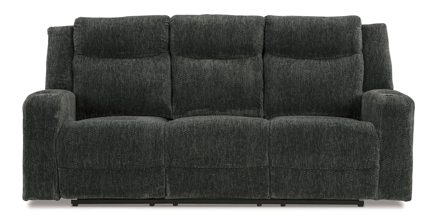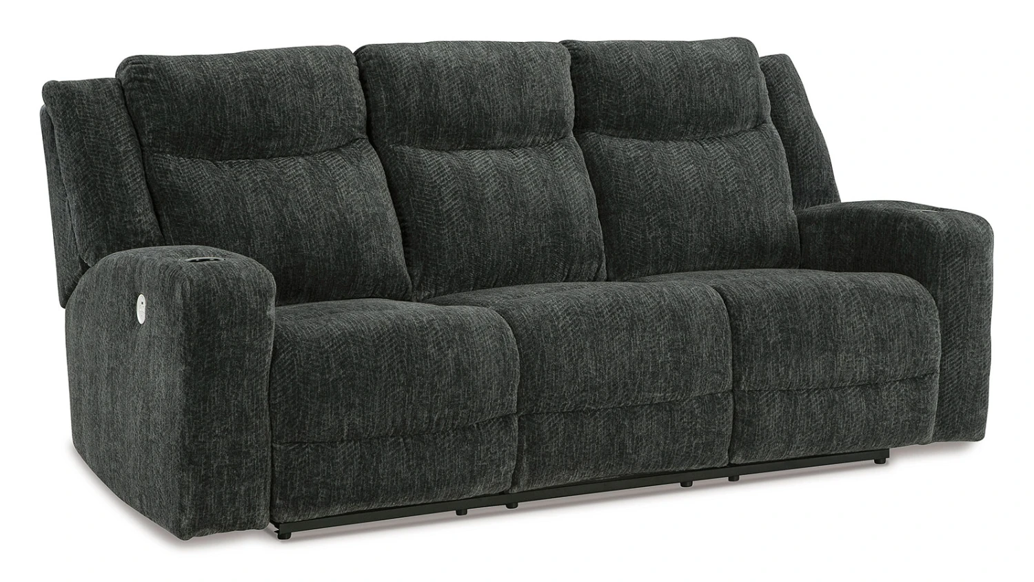 - OverviewIdeal for those who seek synergy of form and function, this Martinglenn power reclining sofa with drop-down table by Signature Design is made for everyday indulgence. Its motion features are decidedly modern; the upholstery velvety soft. A versatile, dark neutral hue takes you back to style basics. Track arms frame the chunky profile, completing this relaxed approach to contemporary decor.
