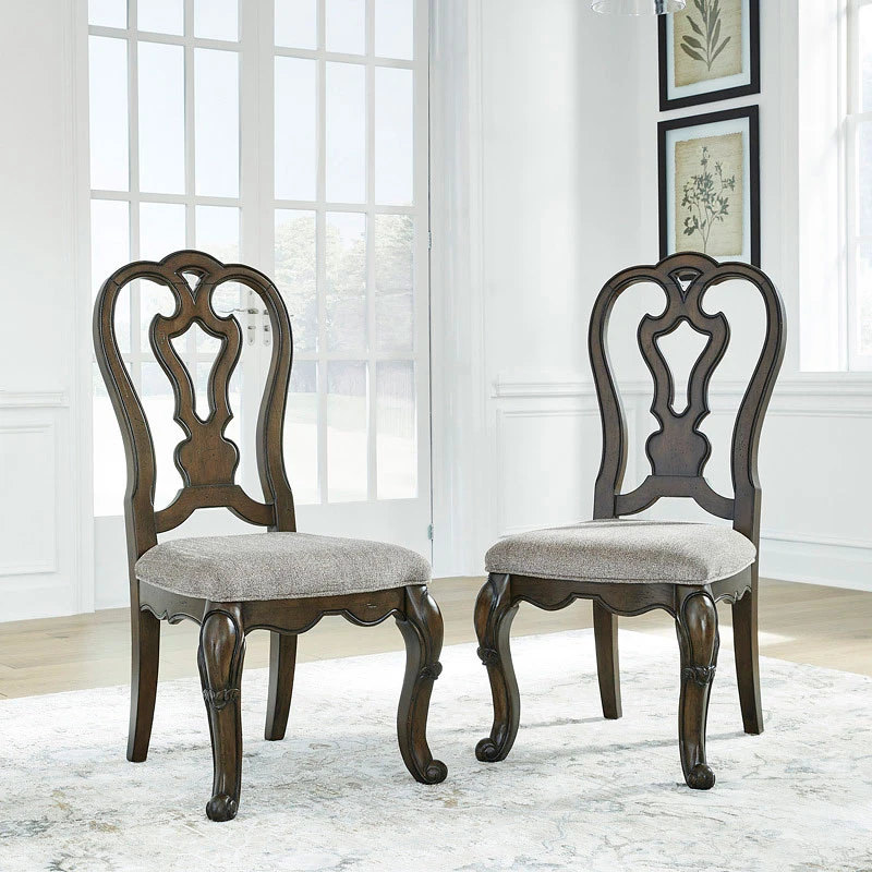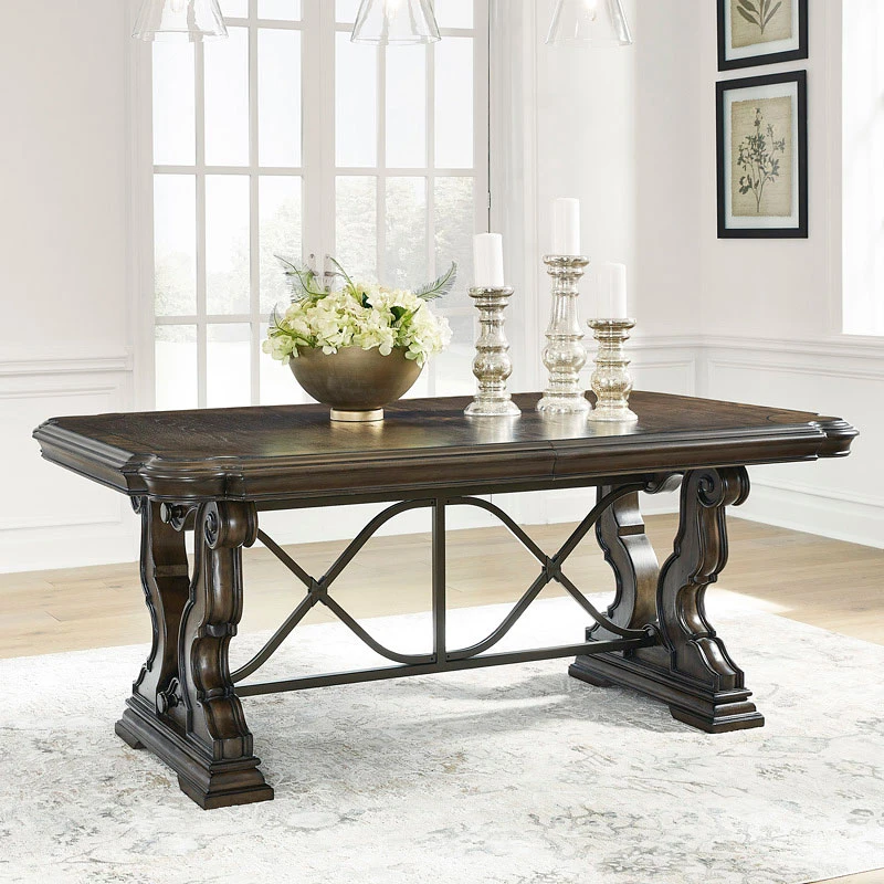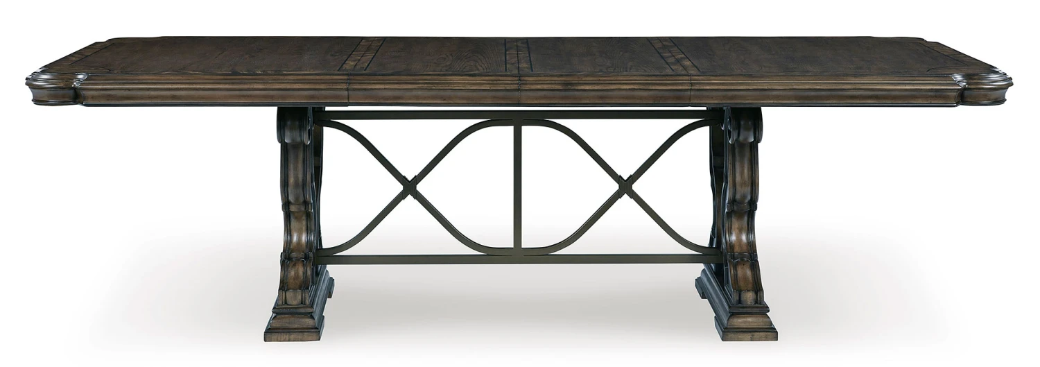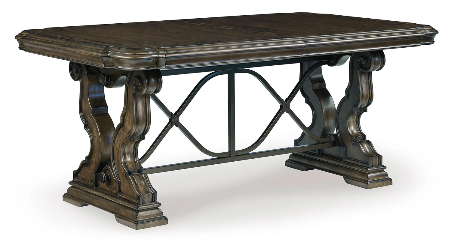 - OverviewFrom its ornamental appliques to its large scale, this Maylee Dining Room Set by Signature Design makes a bold statement. With a shapely tabletop that sits upon a double pedestal base, the opulent set wows with stunning style. The look is timeless. The feel? Right at home.