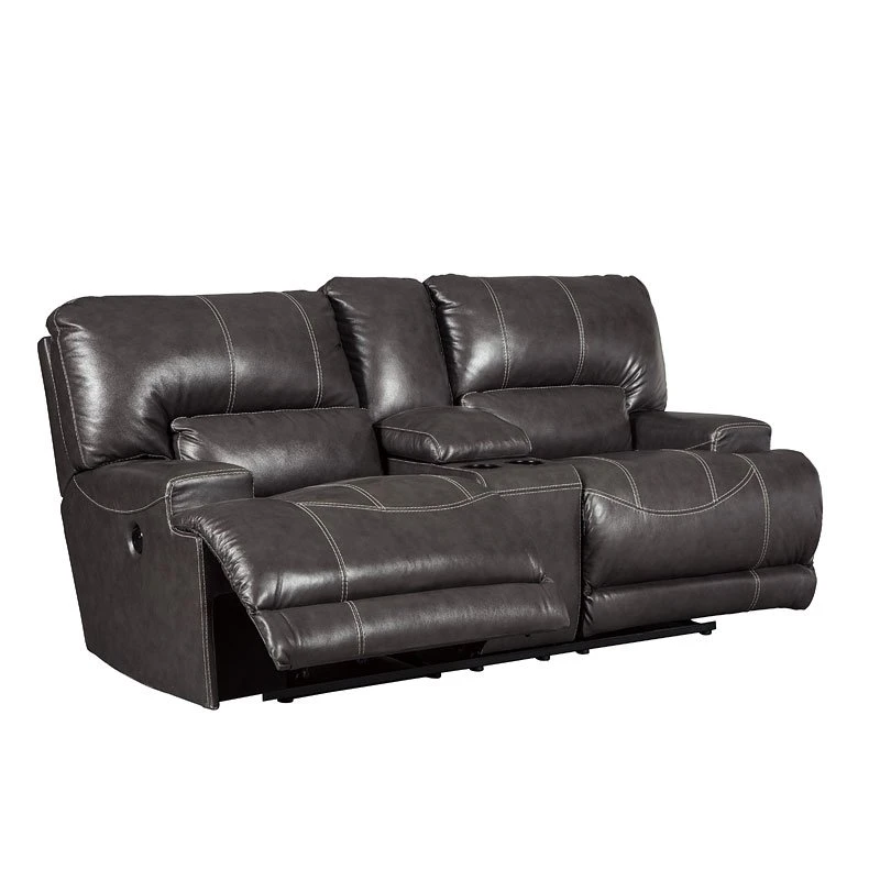 - OverviewSink into the supple McCaskill Power Reclining Living Room Collection by Signature Design and prepare to be swept off your feet – literally. Extra-wide seats and plush cushioning are divinely comfortable while genuine leather upholstery is decadently soft. Prominent stitching, linear track arms and a goes-with-anything gray hue add stylish touches. Keep beverages and remotes close at hand thanks to the center console and cup holders.