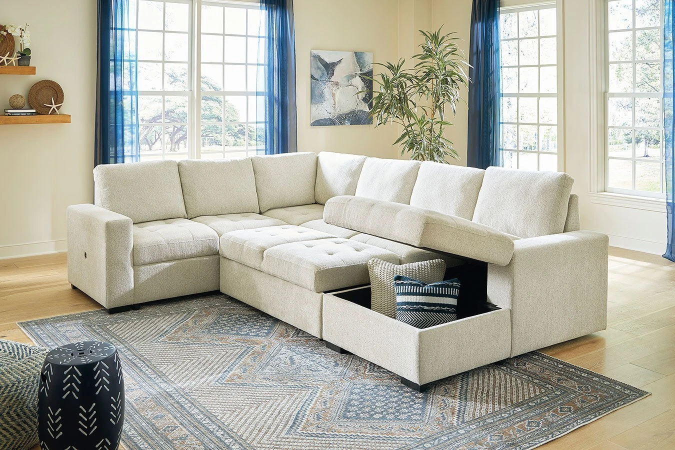 - OverviewSprawl out in style. With ample room for family and friends, this Millcoe Sectional with pop up bed by Signature Design gives everyone the best seat in the house. It’s covered in crisp linen-hued upholstery, with an irresistibly modern silhouette completing the look. Movie nights and sleepovers alike get an upgrade with the space-saving pop up bed that tucks away neatly after use. And if storage is what you seek, the chaise lifts to reveal an area ideal for throw blankets and extra pillows.