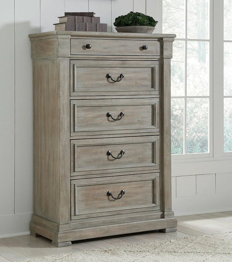 - OverviewPut a simple twist on your approachable sense of style with this classically charming Moreshire Bedroom Set by Signature Design. A glazed bisque finish covers the wire-brushed textural surface, with natural wood undertones bringing additional dimension. Louvered accents embellish the headboard, infusing this chic piece with an air of traditional elegance.
