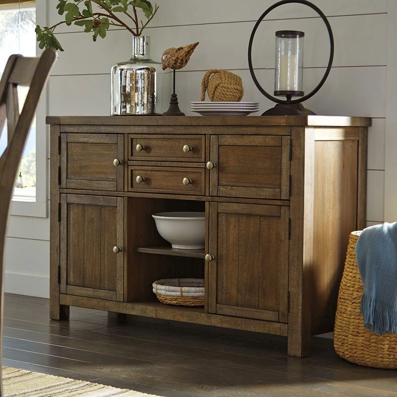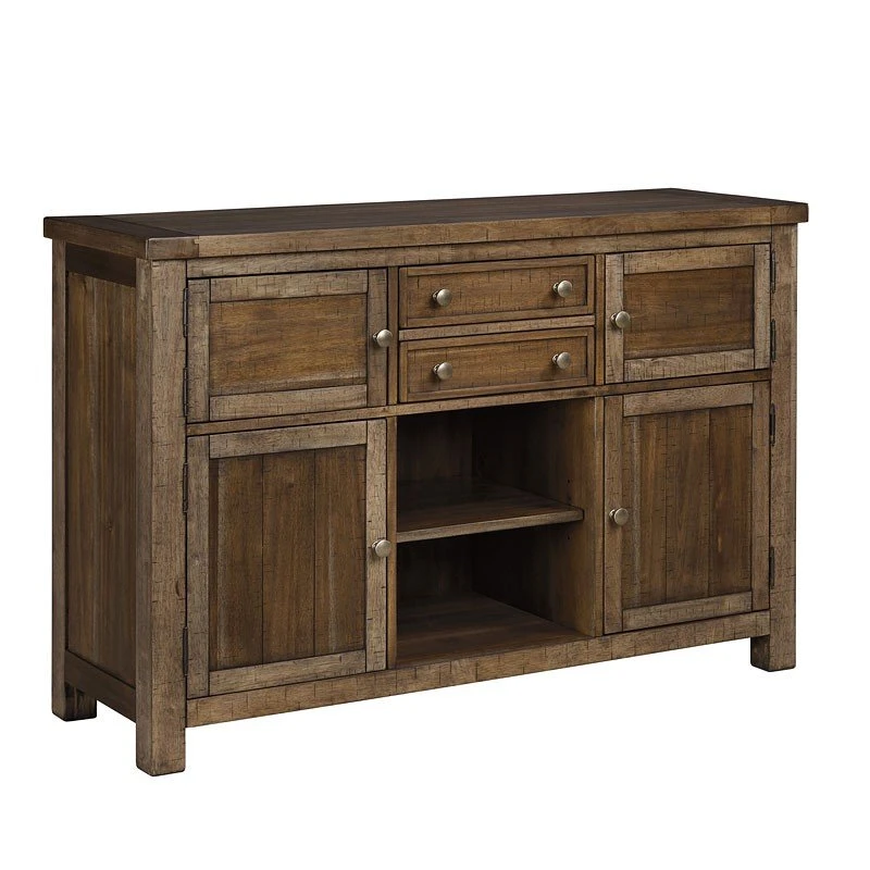 - OverviewThe Moriville Server by Signature Design might be simple at first sight, but a closer look reveals beauty in the details. With the plank-effect cabinet doors and table top, distressed nutmeg finish and antiqued bronze-tone hardware, it’s simply beaming with charm. Stylish server offers abundant storage and even provides display space in the form of two open shelves.