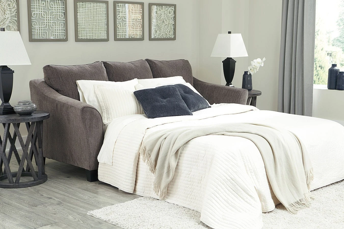 - OverviewThe Nemoli queen sofa sleeper by Signature Design sets the scene for a modern space full of casual flair. Its textured chenille with solid microfiber upholstery provides a luxuriously soft feel that’s inviting. Gently flared arms and plush seat cushions welcome comfort and relaxation. The on-trend slate-colored upholstery offers a perfect background for the four decorative pillows to pop with beauty. Pull-out queen mattress in quality memory foam comfortably accommodates overnight guests.