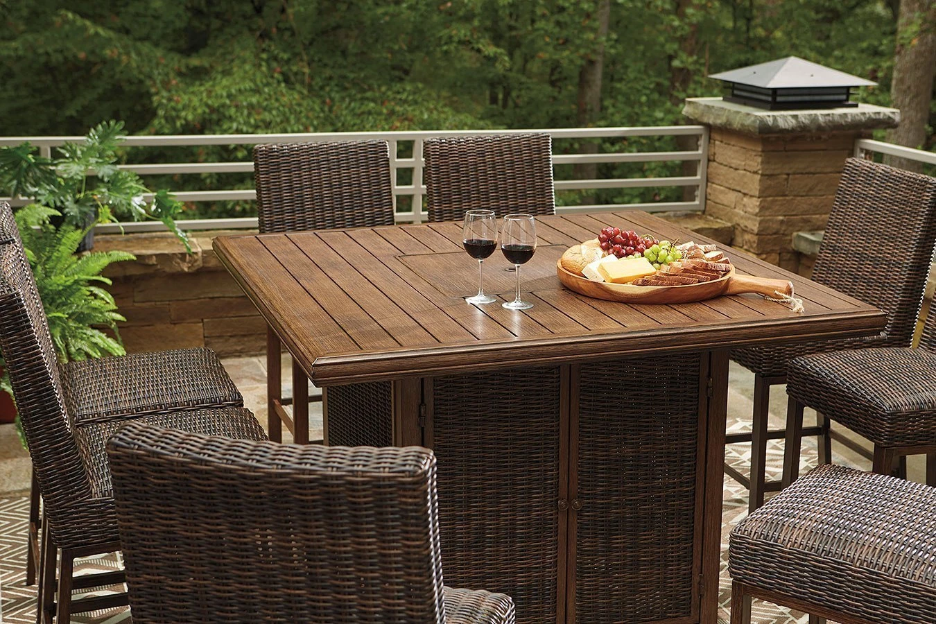 - OverviewTurn your backyard space into your own piece of paradise with the Paradise Trail outdoor table with fire pit by Signature Design. Though this outdoor table looks remarkably like wood, it’s made of sturdy, rust-proof aluminum that’s perfectly suited for al fresco living. Enhancing the rustically refined aesthetic: side panels accented with all-weather, handwoven resin wicker. The result may look high maintenance, but rest assured, this outdoor fire pit table is anything but. With the press of a button, ignite a flickering flame that dances over a bed of glass beads. And with room for up to eight, it’s one highly accommodating outdoor bar table.