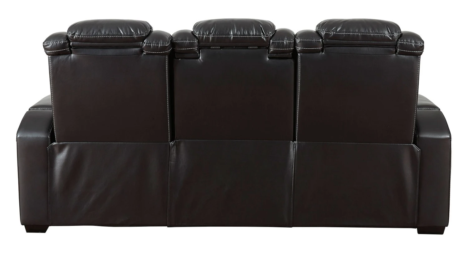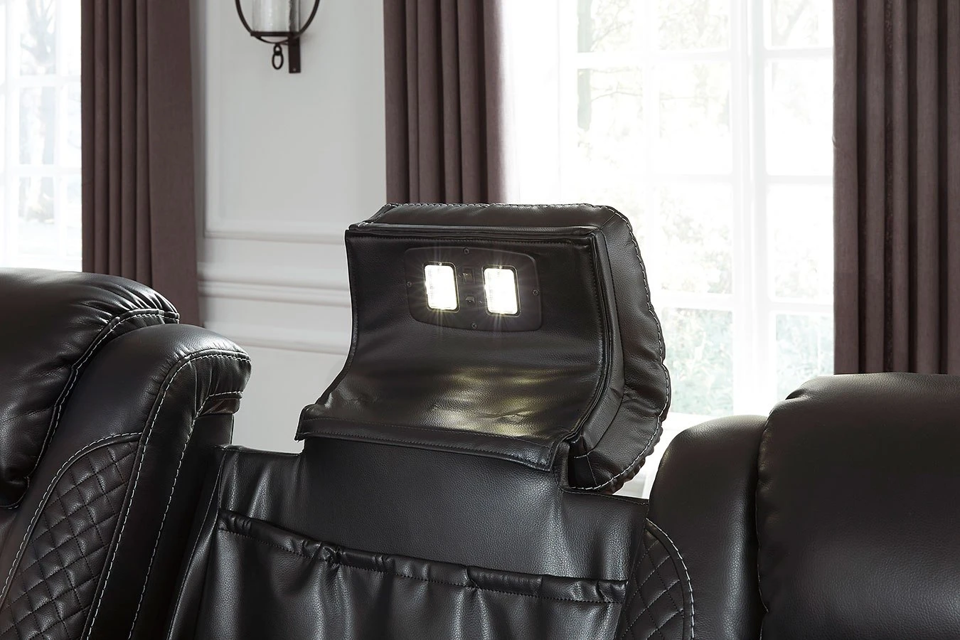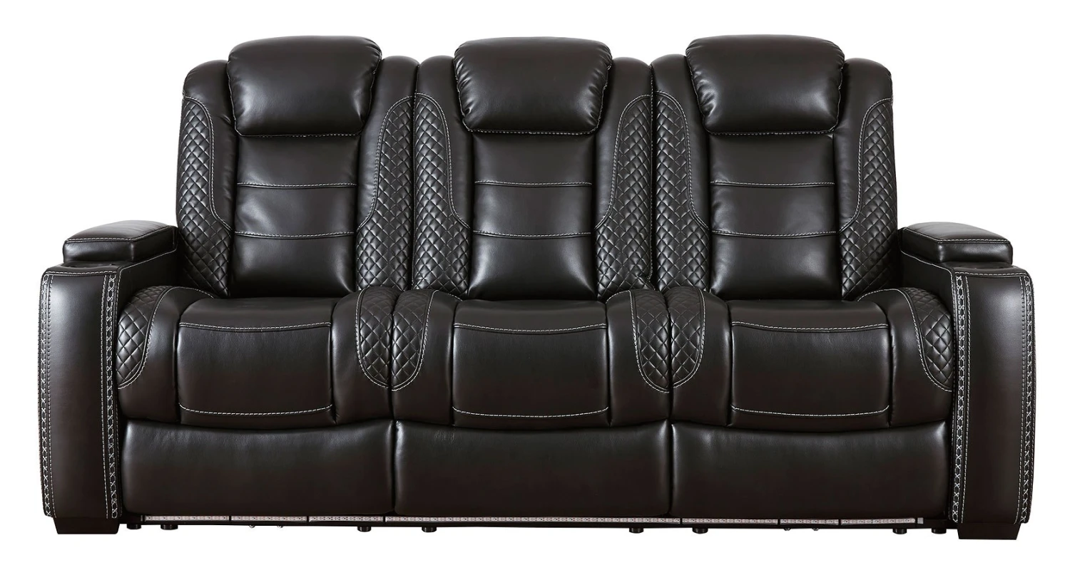 - OverviewCelebrations call for a fun, relaxing place to get together and you’ll find that in the Party Time power reclining sofa with adjustable power headrests by Signature Design. It has a fabulously modern look with midnight-colored polyester upholstery, cross hash stitching, lattice accents and LED lighting. When it comes to comfort, you’ll love the two reclining bucket seats and their adjustable power headrests that deliver personalized angles for TV viewing. It’s convenient too – sporting a center drop down table with docking station, lighted cup holders, flip up padded armrests with hidden storage underneath, and power buttons with a USB port in each control panel. The center seat remains stationary or can be converted into the handy table. A flip up light is located under its headrest. This sofa is certain to become a hit with family and guests.