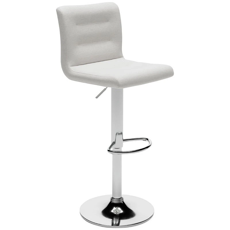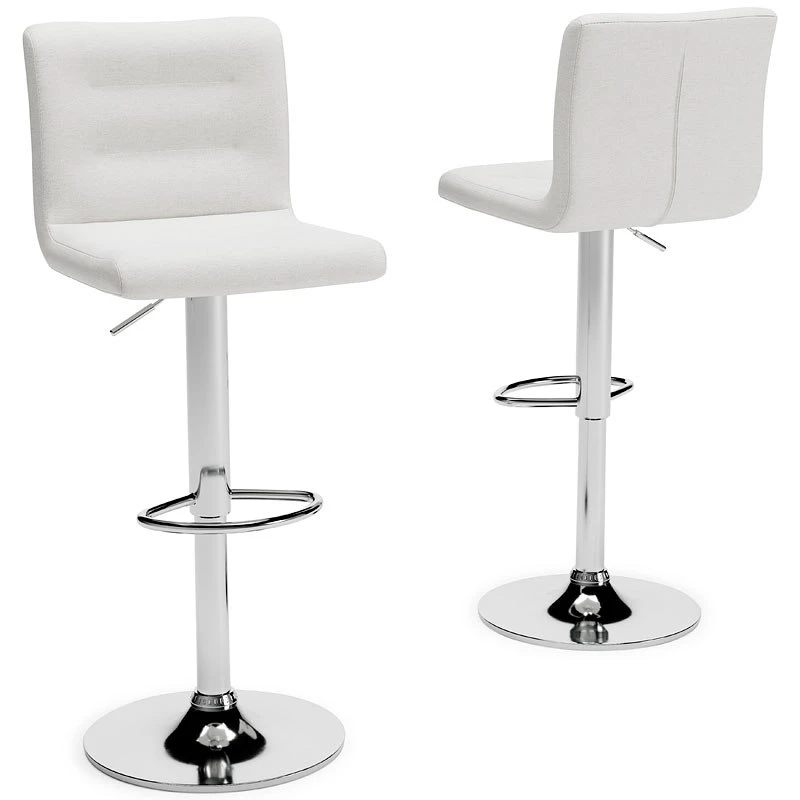 - OverviewHave a taste for highly contemporary style? You’re sure to find this posh and polished Pollzen Barstool by Signature Design something to savor. Crafted with a sturdy steel frame beautified with a brilliant chrome-tone finish, this designer bar stool caters to your comfort with an adjustable height feature and swivel pedestal base. The cushioned seat and backrest are covered in a feel-good stone color upholstery with channeled details that enhance its modern appeal.