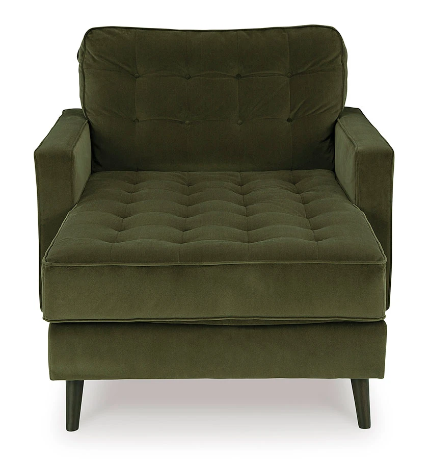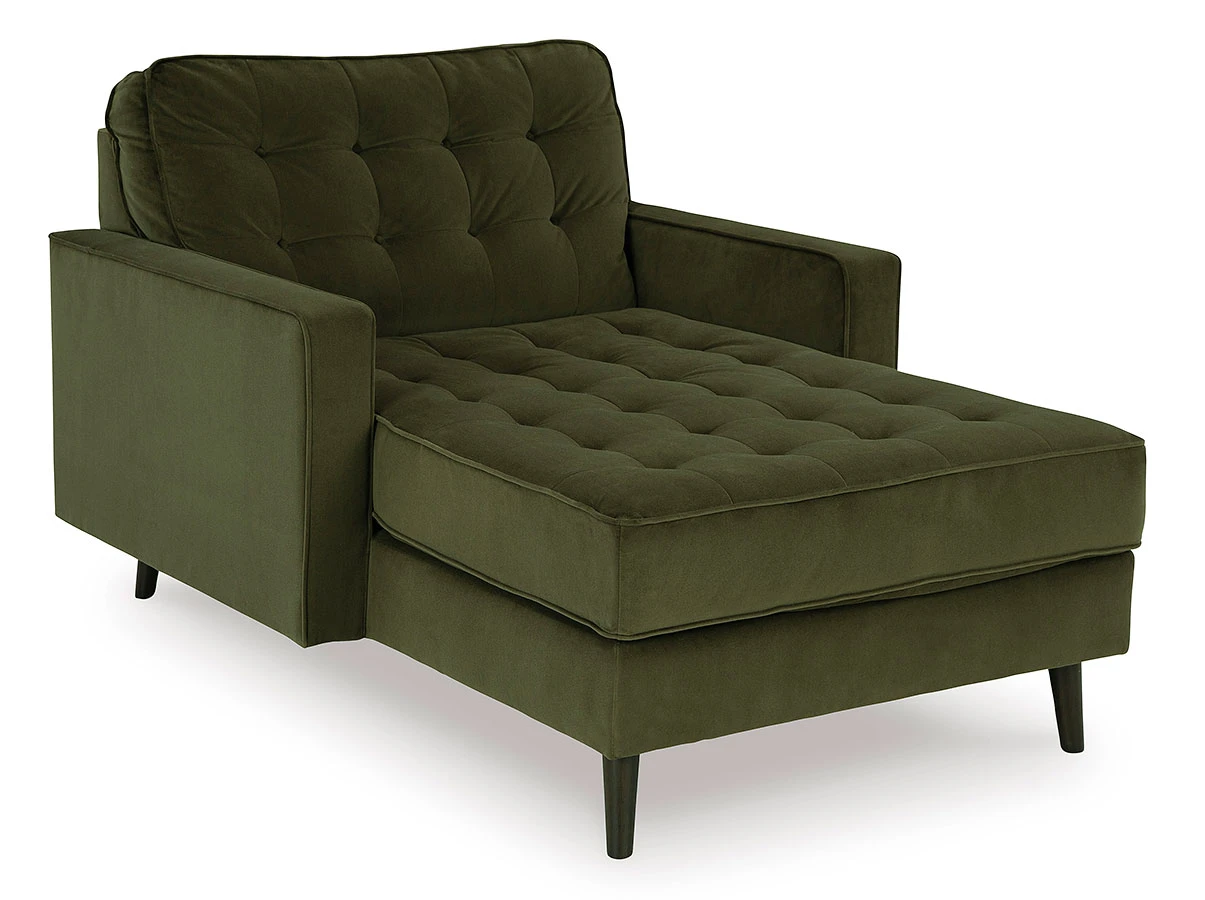 - OverviewThe Reveon Lakes Chaise by Ashley Furniture features contemporary style, polyester upholstery and Olive color. Seat and back rails are cut from mixed hardwood, engineered lumber, and panel board. Cushions are constructed of low melt fiber wrapped over high quality foam.