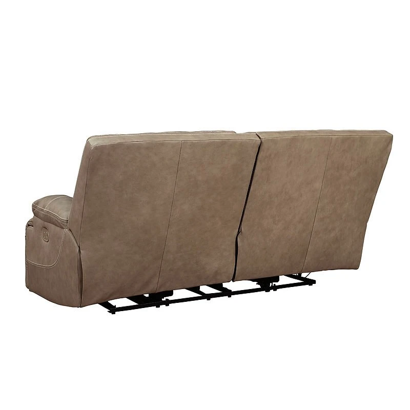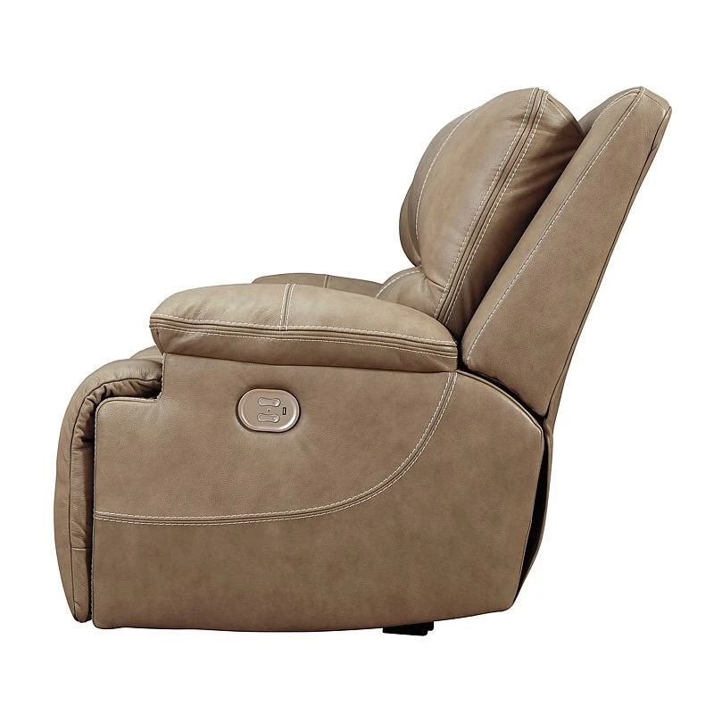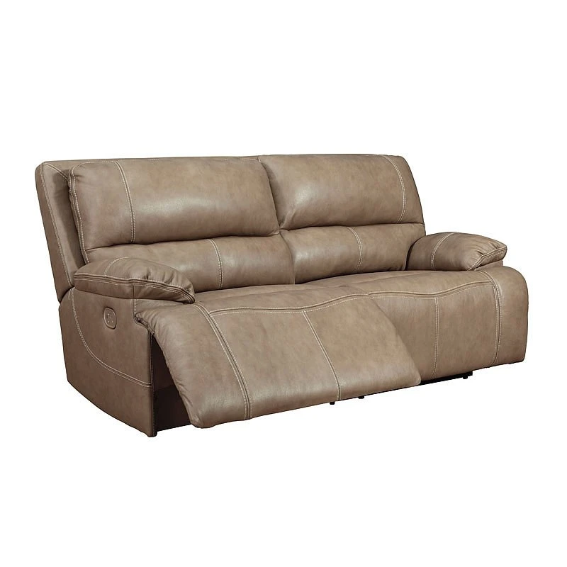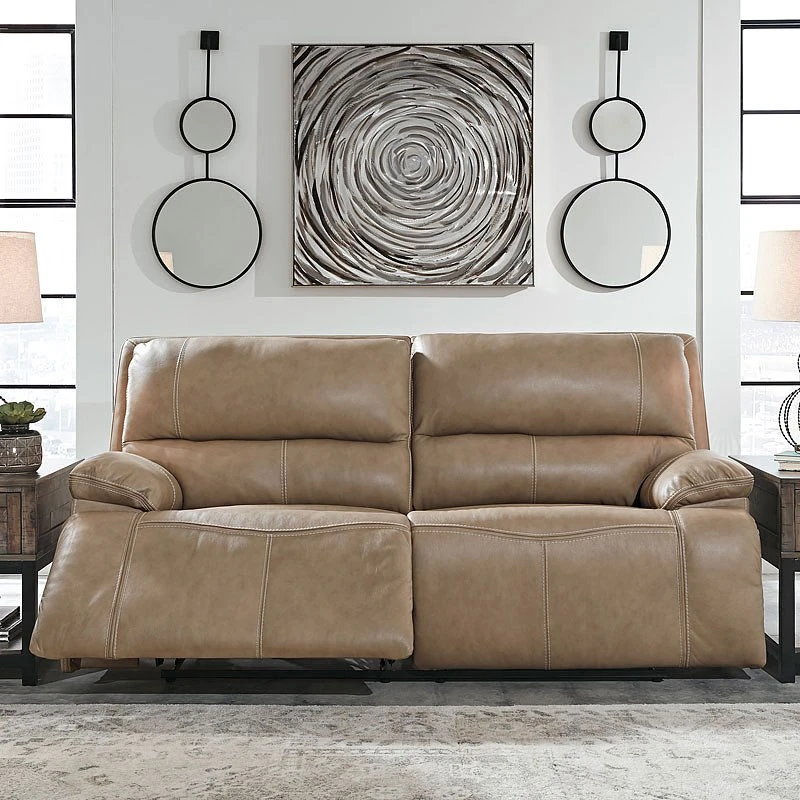 - OverviewLife is so much better when you can enjoy the pleasure of real leather at a price to put you at ease. That’s exactly what you get with this Ricmen Power Reclining Sofa by Signature Design. Thanks to real leather throughout the seating area, you’ve got a reclining sofa that feels like a million bucks but won’t break the bank. Tailored to those with an eye for contemporary design, this power reclining sofa is dressed to impress with an upscale matte finish, clean-lined divided back tufting, distinctive jumbo stitching, and chic pillow top armrests. Perhaps best of all: Easy View power adjustable headrests let you recline back and still have a primo view of the TV.