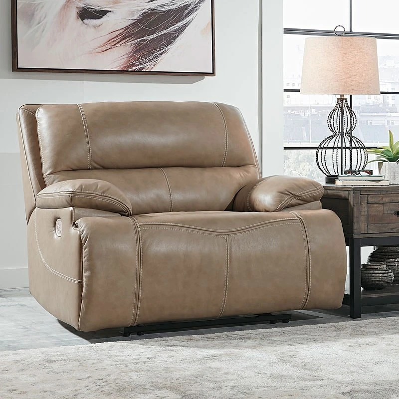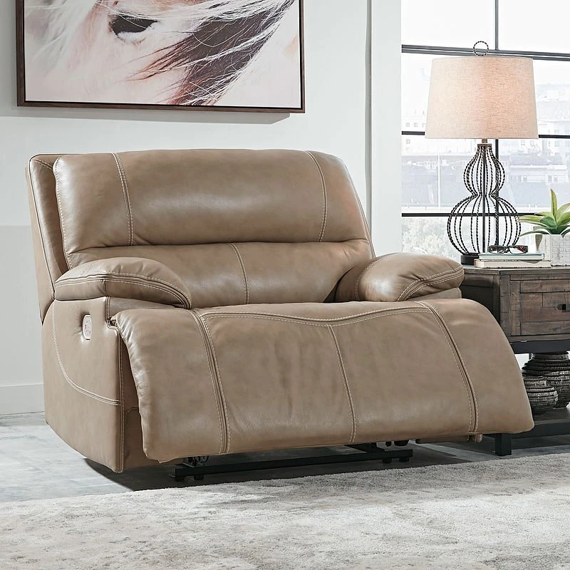 - OverviewLife is so much better when you can enjoy the pleasure of real leather at a price to put you at ease. That’s exactly what you get with this Ricmen Wide Seat Power Recliner by Signature Design. Thanks to real leather throughout the seating area, you’ve got a recliner that feels like a million bucks but won’t break the bank. Tailored to suit those with an eye for contemporary design, this power recliner is dressed to impress with an upscale matte finish, clean-lined divided back tufting, distinctive jumbo stitching, and chic pillow top armrests. Perhaps best of all: an Easy View power adjustable headrest lets you recline back and still have a primo view of the TV.