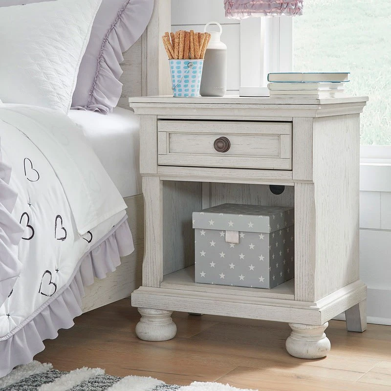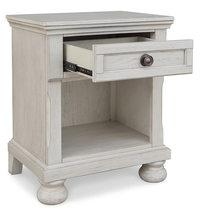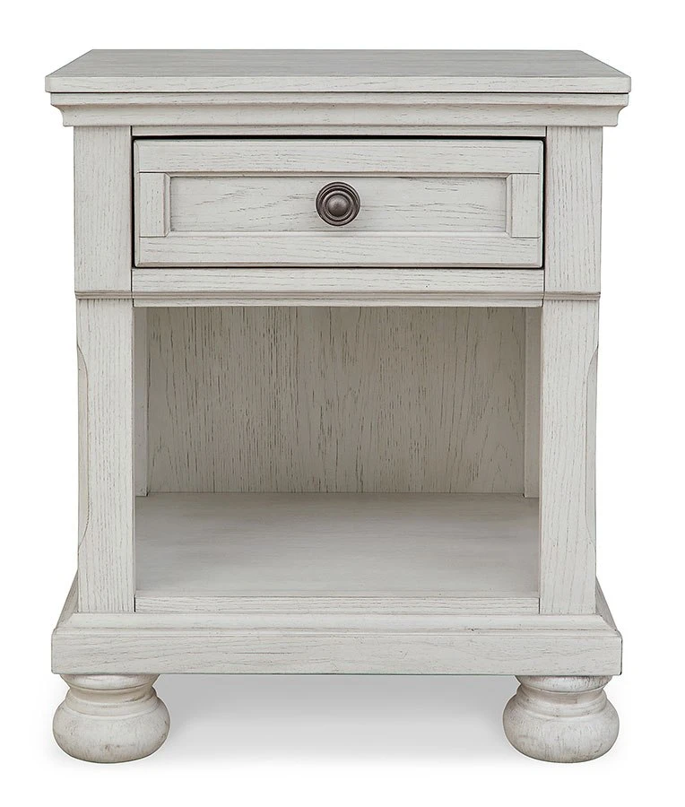 - OverviewElegant, timeless furnishings take your bedroom to the next level. Nothing does that better than this Robbinsdale nightstand by Signature Design. The antiqued white finish with a wonderful grain texture oozes sophistication, while a dark bronze-tone knob adds an ornate touch. A single drawer and open bookcase cubby allow for versatile storage or display options, making this nightstand a functional favorite.