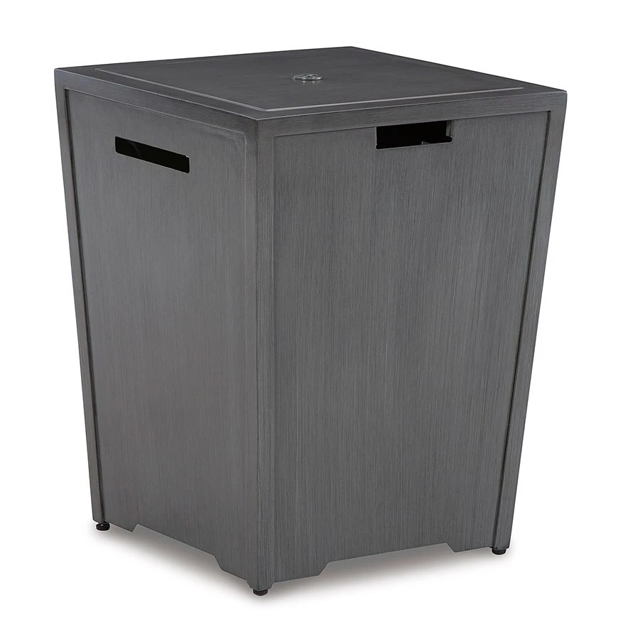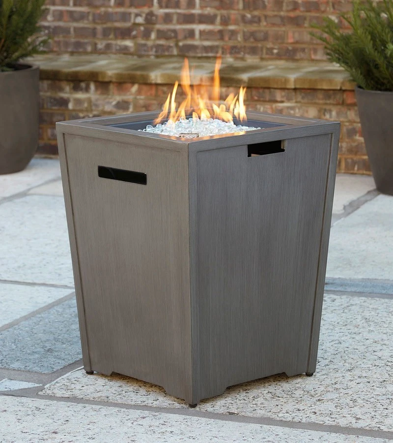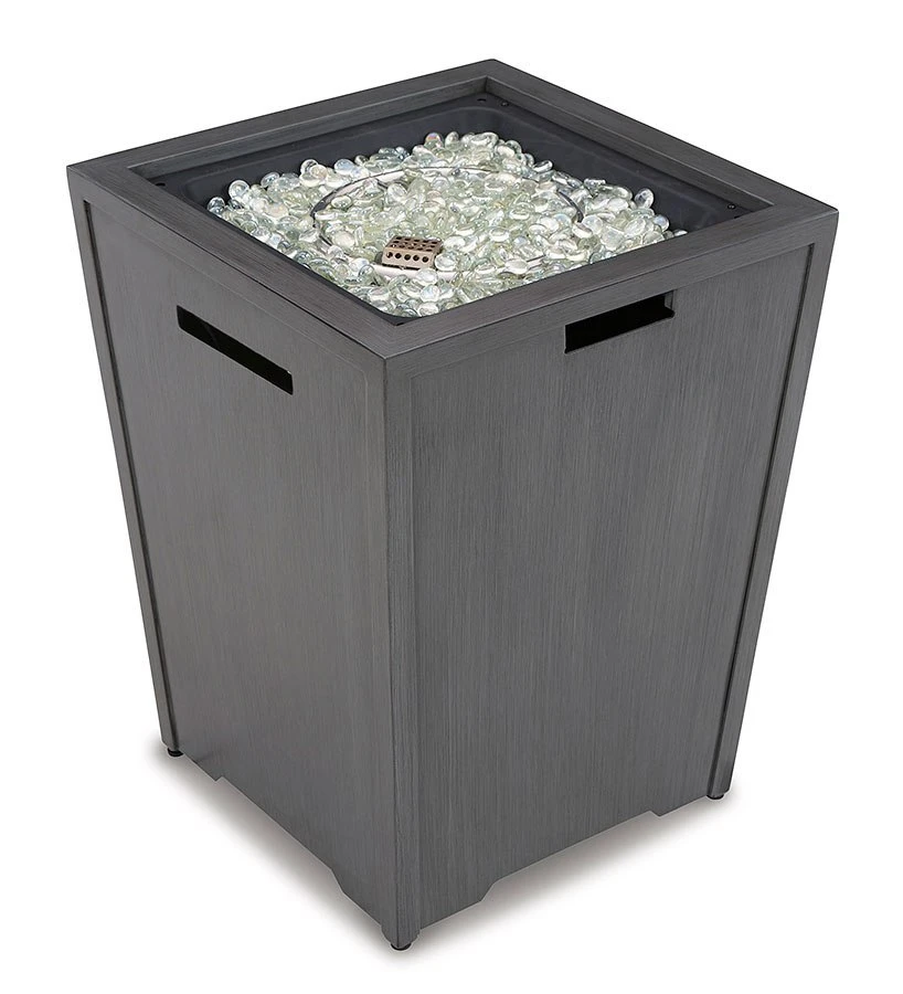 - OverviewSporting a hand-painted gray wood-look finish for a sense of earthy elegance, this Rodeway South Fire Pit by Signature Design is sure to turn your backyard space into a hot spot for entertaining. The way its flickering flame seems to float on a bed of clear glass beads is truly mesmerizing. This outdoor fire pit, crafted with sturdy rust-proof aluminum and equipped with a burner cover and a polyester protective cover, will weather the seasons beautifully.