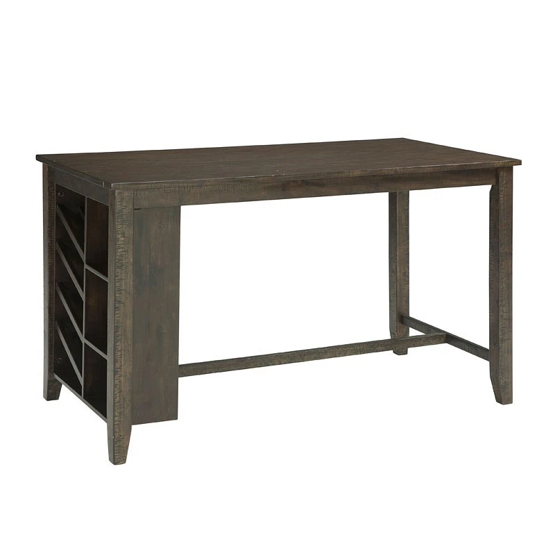 - Overview“Rough sawn” texture and a warm brown finish is where the style begins and your dining area or game room is where this Rokane Counter Table by Signature Design belongs. Relaxed elegance is easy with a built-in wine rack and open shelving. Find functionality and contemporary style at its best with this counter table.
