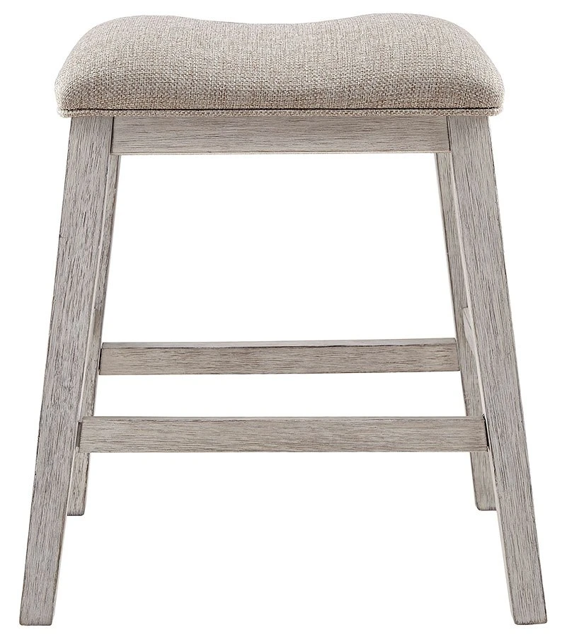 - OverviewThis Skempton upholstered stool by Signature Design invites you to raise the bar on small space living. An inspired choice for coastal chic or modern farmhouse settings, this comfortably cushioned stool sports a grayish white finish with rub-through effect for timeworn appeal.