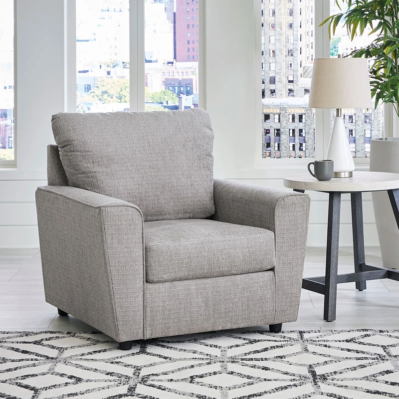 - OverviewThe Stairatt Living Room Collection by Signature Design features contemporary style, polyester upholstery and Anchor color. Seat and back rails are cut from mixed hardwood, engineered lumber, and panel board. Cushions are constructed of low melt fiber wrapped over high quality foam.