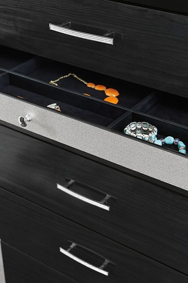 - OverviewStarry, starry nights. Inspired by Hollywood glam, the richly styled Starberry dresser by Signature Design steals the show in a simply stunning way. The dresser’s replicated walnut grain is enriched with a high-gloss black finish, made even more dramatic with chrome handles with faux crystals. Two felt-bottom six-compartment jewelry drawers with silver glitter finish fronts accentuate a clean-lined, contemporary aesthetic.