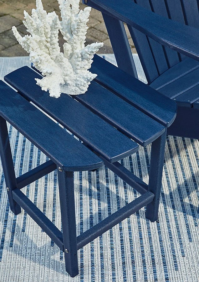 - OverviewAdd cottage-quaint charm to your outdoor oasis with this Sundown Treasure outdoor end table in blue by Signature Design. Made of MEGA TUFF high-density polyethylene material, it’s sure to weather the seasons beautifully. Designed to shed rainwater, the table’s slatted top with gently rounded corners provides exceptional form and function.